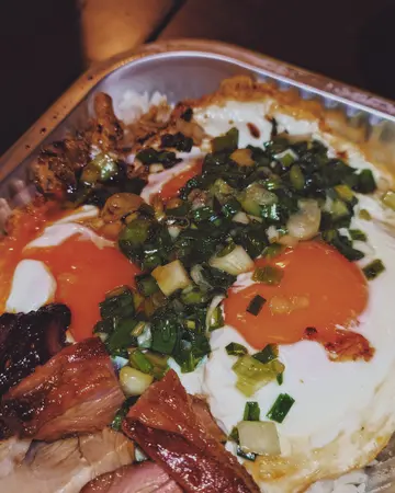 黯然销魂㶶边三蛋饭即系叉烧饭,叉烧薄切,真系做到有窿边,肥瘦适中,靓肉质,送饭食一流。加咗三只蛋卖相吸引,加分。