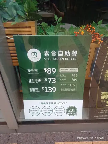 店名「无肉食」,餐点自然是无肉食。偶尔光顾素食店,而素食自助餐却是第一次。本来晚市时限90分钟,见到6月1日当日是不设时限,所以前往试试。将军澳天晋汇店的舖位不容易找,在商场外围的角落处,而商场的指示不够清晰。假日、假期前及斋期,晚市的人头收费是$159,免加一服务费,全自助形式,不会有职员收碟或加茶添水。用餐完毕,去结帐前,得自己收拾及归还餐具。见到有客人用餐结帐后直接离座,职员会请他们折返执拾。素食自助餐所供应的食物款式都多元化,餐点旁会有牌列明种类是奶素或蛋奶素,对真正素食者应该是友善的措施。西式食品有pizza,中式食品有咕噜肉、酿茄子、酿冬菇,日式食品有寿司、仿三文鱼刺身,还有多款天妇罗及炸物。椒盐粟米香口惹味,微脆又不会太咸。咕噜肉的酸甜度恰好,味酸开胃,咕噜肉refill后所用的原料有点不同,用的面筋较为松软易咬。酸斋柔软入味,酸度足。奶油炸物及酿茄子的味道可口,奶油炸物的味道有点像大陆卖的小贝。茶叶蛋好入味,茶味香。这次素食自助餐吃了不少时蔬,如金银蛋炒菜心,炒菜类的镬气足。汤品及粥品类有皮蛋粥及粉葛汤,粉葛汤很有家中的老火汤火喉,不是味精汤。甜品有陈皮红豆沙、红豆糕、凉粉、沙律,还有水果。不过我太迟才取,甜品没有refill。水果的卖相不吸引,哈密瓜及菠萝好像好干身,果不其然的西瓜及哈密瓜的甜度一般。$159吃素食是抵不抵食就见人见智,于本人而言,体验一下也是不错。有些素食餐点是几好吃的!