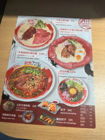 餐厅:无限ラーメン地点:湾仔皇后大道东菜式:日式拉面餐牌:四款拉面、迷你丼饭、小食、饮品特制和牛牛骨白汤拉面 $168特制和牛牛骨白汤拉面卖相一流,一共有9大块和牛围喺碗边,粉嫩又淋,牛味好浓,点少少汤食超正。个奶白色牛骨白汤起嗮白泡,好好饮又唔觉有味精或者油腻,牛味唔错,好厚身又滑溜。其他配料仲有甜甜地好香口既火炙半肥瘦香脆厚切叉烧两块,糖心蛋一开二,扁笋,洋葱碎,葱花同菜苗,材料丰富。面条系幼身,有咬口又有蛋香,好味。牛骨麻辣叉烧拉面 $108呢款牛骨麻辣拉面好特别,汤底一样用牛骨汤但加入麻辣风味,麻辣味劲香,辣得过瘾。其他配料有一件叉烧,肉碎同葱花。好有中式风味。特制和牛丼饭 $28特制和牛丼饭细细碗,饭面加有好多粉嫩和牛片,温泉蛋黄一只同葱花配七味粉。整穿只温泉蛋黄先,捞埋和牛同d饭,和牛汁少少甜甜地,原来加有少少日式芥末,加埋蛋黄汁入口更滑溜。饺子 $45饺子一客5只,皮煎得㶶面,口感又脆又带少少烟韧,咬开入面有肉有菜,点埋枱上面既饺子醋食更加好味!青森苹果汁 $20从来未见过呢款苹果汁包装,好新奇。今餐拉面好正,真心推介牛骨白汤拉面,其他食品质素都好高。餐厅环境干净卫生,坐得都舒服。查看更多