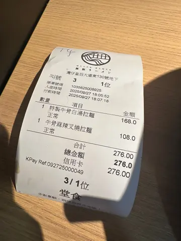 好耐无食拉面,有d挂住,知道呢间系过江龙店,今晚又唔洗排队,就即入小店好有日本feel,系入座前要喺部点餐机落单付款先,然后入座,都几好,可以食完走人,唔洗等人过黎先埋到单1)特制和牛牛骨白汤拉面初初有小小担心d和牛会唔会好似餐牌既图片咁,d和牛系鲜红色,好彩上碟时系刚熟的暗红色,好好多😆😆😆 即刻饮啖汤先,好鲜甜、唔咸,仲想饮多几啖的感觉,拉面挂汁,材料丰富,仲有烧到焦香既叉烧、同1只开边糖心蛋,超满足!围碗边既和牛够薄切,唔「溜」👍🏽👍🏽2) 牛骨麻辣叉烧拉面 呢个食得小小辣既一定要试,就算我去日本,都未食过麻辣汤底既拉面,而且汤底都系挂汤,叉烧虽然肥美,但一d都唔腻口,仲系烧到有微焦👍🏽👍🏽3) 迷你火炙叉烧丼饭 呢个火炙叉烧饭好好食!新鲜热辣奉上,而且有炭烧焦香味,叉烧切到细细粒容易食,真系非一般的叉烧饭哦,系食唔够喉的感觉~4)特制和牛丼饭呢个和牛配上日本生蛋黄捞汁咁食,浓香蛋汁同和牛都系咁夹,一啖肉加啖饭,呢个有超满足的感觉!苹果汁系日本架,圆筒纸盒包装好得意😄听住日文歌喺bar台食拉面,真系好似喺日本咁呀!服务好贴心,每张櫈下面都有个篮可以摆嘢,亦都唔催人食完就要走,咁就食得唔洗赶#无限拉面 #湾仔拉面 #日本过江龙 #牛骨白汤 #日本拉面查看更多