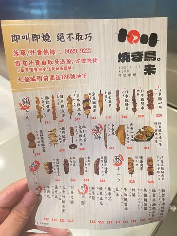 🍢🍢🍢过口瘾串烧外卖平时想食串烧又觉得好贵嘅话,可以嚟呢间日式串烧店,佢主要做外卖,可以单点一两串,过下口瘾,用嘅都系日本产食材,但价格尚算经济。但因为即叫即烧可能要等15分钟左右,想食嘅可以早啲落单。☑️紫苏无骨鸡中翼-$23呢个推荐,一串2件,皮脆而入面超juicy, 起左骨包住紫苏叶,味道特别又食得方便。☑️猪颈肉串-$18都算juicy 多汁,吾会太干太靭☑️多春鱼 -$13烧得几脆,吾会腥🔸焼き鸟。来🔸地址:九龙城衙前围道136号地舖…查看更多