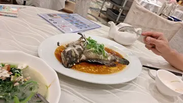 间中都想食下中菜,Megabox 13楼就有间煌府1号,比楼下清静,又有个靓view星期六晚客座有个虎虾元贝二人餐,$418包加一同茶芥(餐前小食另计),好似好抵咁梗系要试试!🥣 淮杞炖螺头汤汤料见到有淮山、杞子、鸡脚螺头、瘦肉,味道好清,清到好似饮水咁🦐 高汤焗大虎虾伊面有两只大虎虾嘅伊面,虎虾肉质正常,伊面几出色,烟韧软糯,索晒高汤好入味🐟 清蒸沙巴龙趸班原条蒸鱼,正!蒸得几好,唔老唔韧,鱼皮胶质丰富,不过好多细骨🧊 冰镇鲍鱼我会称呢个系呢餐饭嘅mvp!一上枱就见到比预期中大只!面头洒咗蟹籽,另外有跟日本豉油同wasabi,日式煮法过嘅鲍鱼软滑有𡁻口,调味恰到好处,用刀叉食真系好有feel🍴😋见到单叫都要58蚊一只,二人餐有两只,可见呢个餐真系抵食🍗 润烧脆皮乳鸽一只乳鸽分四份,上枱时热辣辣,外皮炸到脆卜卜,油脂甘香🥬 金银蛋浸菜苗套餐点都有碟菜,落埋金银蛋,相当抵食🥭 精致糕点我𠮶晚食嘅系杨枝甘露糕,唔系太甜,有西米露同埋芒果粒,作为饭后甜品都几开心Megabox呢间煌府嘅职员服务态度都几好,见佢哋同好多熟客都有讲有笑,对住我哋啲生客都亲切友善🍽 煌府1号🗺 九龙湾宏照道38号企业广场5期MegaBox 13楼4号舖