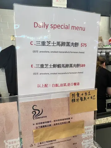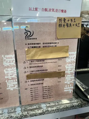 。餐牌分为传统肉饼类及烟熏肉饼类,套餐包了白饭、油菜和足料老火汤,而且,更标明采用新鲜肉制作,即叫即蒸,诚意十足。今晚传统少少选了「土鱿马蹄蒸肉饼餐」($58),青红萝卜猪骨汤十分老火,店主更特意加热,好像生滚粥般,而菜心清甜,至于主角蒸肉饼,肉饼打得松化,混入了很多土鱿及马蹄,自不然食味与口感都升上一个层次