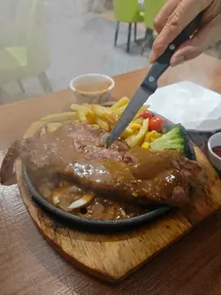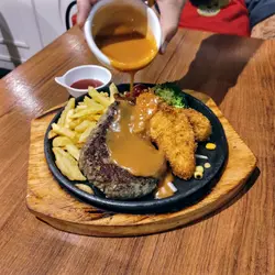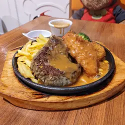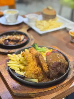 放左工过黎Megabox食啲野,拣左食熊小馆。一来贪佢多选择,二来佢价钱相当亲民,食物味道又唔错,平日lunch都成日过黎食㗎。睇睇餐牌,好多野都啱食,决定点两份餐,食完再睇下加唔加甜品啦。⭐餐汤+餐包是晚系罗宋汤+蒜蓉包,罗宋汤好浓厚嘅蔬菜味,酸酸甜甜正好开胃😋⭐铁板牛柳拼吉列鱼柳先来的铁板餐,一大块牛柳+炸鱼柳,仲有大量薯条,伴碟仲有西兰花同蕃茄仔,诚意十足😆牛柳软腍香口,鱼柳外脆内边嫩滑,薯条都好脆口㗎,味道真系唔错🤤唯一挑剔下个酱汁,拣左烧汁,味道偏淡少少啰。⭐芝士忌廉焗盲𫚧鱼菠菜中间系一块劲厚身嘅鱼柳,又嫩又滑好好味,旁边放满薯蓉,焗得焦香😋个白汁加芝士劲啱口味。但说的菠菜呢?唔见嘅?原来在鱼柳下面,翠绿爽口,正。⭐黑熊餐饮转左特饮黑熊,即系平时饮嘅黑牛熊小馆版本😆一样系可乐加朱古力雪糕,但仲多左只士多啤梨熊,即刻可爱几多♥️等朱古力雪糕溶左落可乐先饮,正!⭐冻咖啡朋友要左冻咖啡糖水另上,甜度自己控制👍抵食😋…查看更多