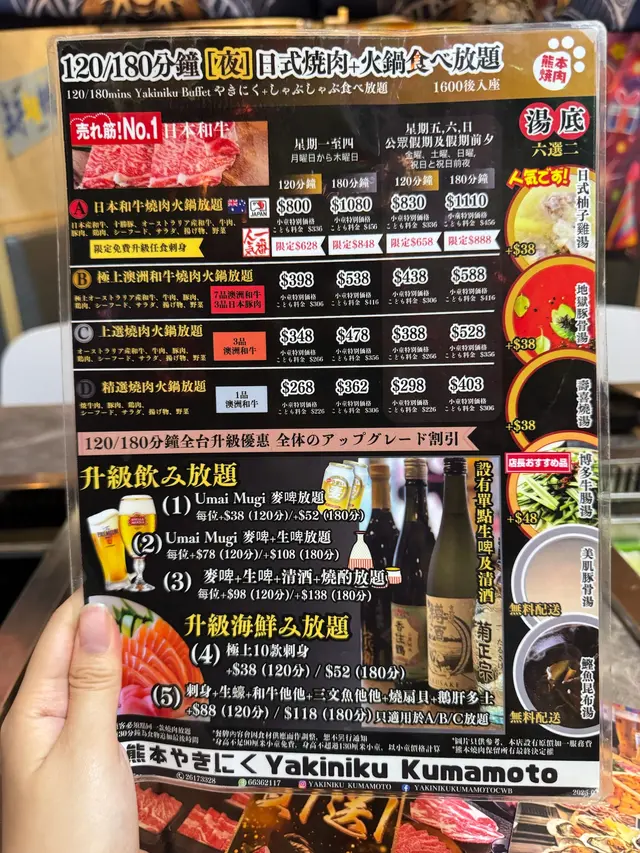 嚟到銅鑼灣嘅熊本燒肉,真係一試愛上,主打120分鐘精選澳洲和牛燒肉火鍋放題,燒肉+火鍋雙重體驗,性價比勁高,和牛、飲品、雪糕、雪條任食,食到停唔到口 🍽️🔥。入座兩位或以上,即送原條鰻魚壽司配超迷你飯一客,細細件但幾有誠意,打卡又啱 ✅🍣 仲有鴛鴦鍋湯底,加$58黃金粟米湯拼豚骨湯,粟米湯香甜,豚骨湯濃郁,煮肉煮菜都啱口味 🫕🌽。想升級海味感覺,最平加$88/位就任食生蠔、鵝肝蝦片、和牛他他及十款刺身,冷盤層次即刻拉滿 🦪🥢燒物選擇真係多,醬燒牛排骨入味油香,牛柳粒燒嫩口多汁,牛舌爽彈帶焦香,牛肩胛肉同牛三角肉脂香平均,燒到微焦最啱我口味 🥩🔥。澳洲和牛板鍵油花靚,快手一燒已經滿口肉汁,好滿足 😋✨。除咗牛,仲有燒豚肉同燒雞肉,配返和風小食同炸物,口感同節奏都拿捏到位,邊燒邊傾真係寫意 🍗🥓。甜品、雪糕、汽水、茶任飲任食,收尾清新又輕鬆,放題體驗加分 📦🍦價錢方面,$268嘅「120分鐘澳洲和牛燒肉火鍋放題」已經好抵食,想再豪一d就加$88任食生蠔同十款刺身,整體CP值相當高 💰👍。店內有熊本優質肉貼紙/證書,食得更安心,品質有保證,呢點值得讚 👏✅。如果提前落訂確認訂座,仲可以享用主餐牌「無限時」,慢慢嘆唔洗趕,四位或以上更送價值$228嘅意大利汽酒一瓶,訂座仲包「慶祝畫碟及生日佈置」,生日聚會啱晒 🎉🍾。餐廳亦會送生日甜品+畫碟,發辦驚喜小心機,氣氛感十足 🎂🖌️總結嚟講,熊本燒肉以多款優質肉類、雙重燒肉火鍋體驗、加上多重贈送同訂座禮遇,無論朋友飯聚定生日慶祝都啱用,價錢實在,質素都穩定,值得回頭再試 ✅🍽️…查看更多