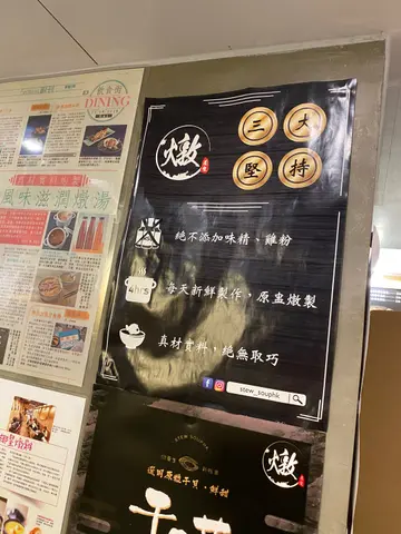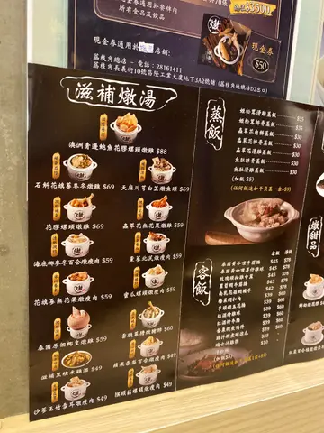 香港人钟意饮老火汤,呢间炖汤店起正荔枝角港铁站出口隔离,容易揾,而且汤水选择都几多,都系滋补款,男女老少都啱饮,有时行开附近都会特登过嚟饮啖汤,个人最欣赏佢个天麻川芎白芷炖鱼头汤。呢间胜在价钱亲民,出货快唔使点等,汤水无味精(所以会偏淡,可以问店员攞啲盐),店面整体都算卫生嘅(佢荔枝角店系外卖自助式,所以有时会出现啲嘢食完冇人收,积咗起张枱度嘅画面)。如果对汤水冇太大兴趣,佢都有糖水,蒸饭,中式小食可以试吓嘅,甜品个人推荐花胶炖鲜奶; 小食嘅佢个蒸白鳝都唔错,几鲜甜,不过好似系时令,唔系成日有。另外,好多人都知呢间店系某个TVB艺人开㗎啦,如果有心想见吓艺人,听讲佢周不时会亲自起店面服务,见过佢亲自收银,抹枱,收垃圾同跟单,对啲客人嘅合照要求有求必应,又会同客人讲多谢支持,几贴地。我起佢间铺见过佢2次,2次都系周五傍晚。