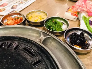 装潢格局与韩国的烧肉店十分相似,好像去了韩国一样。有四小碟前菜,当然有不能少的泡菜!下单后,店员提著水壶在炉边倒入蛋汁和加入粟米。炉有三个坑位,只会使用两个坑位,而剩下的是用来载著烧肉的油。牛肉炒粉丝 ($78)粉丝弹牙爽滑,口感烟韧有嚼口,味道带甜,十分醒胃。大葱蜜糖炸鸡 ($69)外皮金黄酥脆,肉质柔软,入口带甜,吃起来不腻口。牛肋骨拼盘 ($328)酱腌牛助骨肉150g,调味牛护心肉100g,降霜一口和牛100g,顶级和牛舌80g牛舌爽弹、护心肉肉味浓郁,有嚼劲、一口和牛油脂丰富,十分香口、牛助骨肉肉质厚实,嚼劲十足。用生菜包入烧肉来品尝,可以把油腻感消除,口感清爽。店内的抽风系统非常好,不会有烟雾弥漫的情况出现。而且冷气充足,不会吃到汗流浃背。