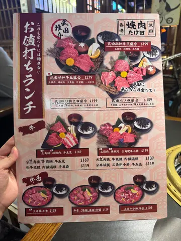 第一次嚟武田烧肉,一入门就闻到淡淡炭香,环境以木系设计为主,日式简约但唔局促。枱距适中,抽风系统做得好,烧肉时冇油烟味,坐得舒服。肉质方面真系出色。🐮 牛肉新鲜度高,油花分布平均,轻轻一烧就渗出香气。无论系厚切牛舌、牛肩脊定上等牛肋眼,每啖都嫩滑多汁、肉味浓郁。海盐、烧汁同柠檬汁三款配搭各有风味,我自己最钟意简单洒盐,最能食出肉嘅原香。🍤 海鲜部分同样新鲜,虾肉爽甜、带微焦香。甜品区同饮品选择都几齐全,最惊喜系有雪糕同水果自助吧。服务员态度亲切,上菜快,换网勤快。整体感觉系一间「认真对待食材」嘅店,诚意感十足。外面的自助吧有好多好味的甜品,有雪糕、唔同款式甜品,因为临近中秋仲有中秋月饼,真系好应节!…查看更多