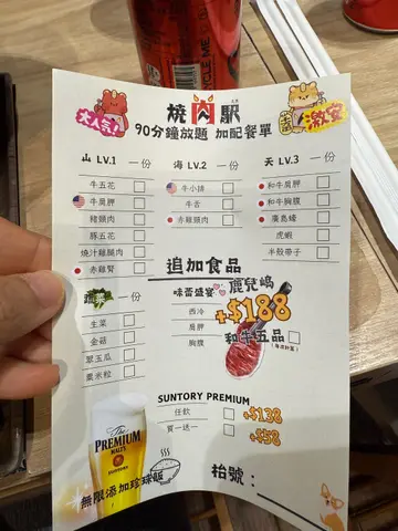 有时候得闲都会自己一个人去食烧肉,但去开个啲连锁式烧肉店都系限定一个个set,然后再令加肉。以我一个食肉兽来讲,每次咁样食一食,都差唔多要二百蚊,所以都想揾啲可以一个人仼食烧肉既店舖。点知最近又真系揾到!仼食餐牌分咗3个Level ,而我自己就拣咗Level 2基本配置都系有饭有汤同泡菜佢哋首先会直接比碟肉你先,食完唔够可以写纸再加。饮品好似另计,但水就仼你饮 ~而饭隔离个碟系Level 1既肉。再隔离个碟就系 Level 2既肉。依碟系Level 1既肉,但烧咗几块先记得影相。依碟有齐猪牛鸡,就正正常常,唔会有臊味。Level 2既肉~依碟就系牛小排、鸡颈、牛舌。总括而言,我觉得系一间几好食既烧肉,至少可以满足自己一个人食烧肉,但又想仼食既我🤣