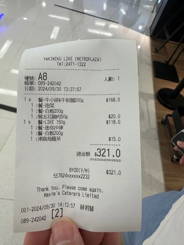 今日去開葵芳做嘢,夜晚去咗新都會附近睇吓有乜嘢好食,大概5:00左右已經見到有間舖頭爬得好多人原來叫做燒肉like,出邊見到佢哋餐牌都尚算價錢合理,所以我哋即刻排咗張飛就等啦。咁大概5:00呢就等到6點就有得入去啦。咁我哋呢就叫咗佢個招牌牛五花啦最平我餐,50幾蚊都有交易。我哋都加咗唔少嘢,例如木魚飯啦,溫泉蛋。我哋最後埋單都係百零蚊左右都算幾抵食。再講吓佢啲嘢食,啲牛肉呢就一般般啦,但係呢個醬汁就十分之吸引,再加上個價錢呢,我下次都會再幫襯嘅!查看更多