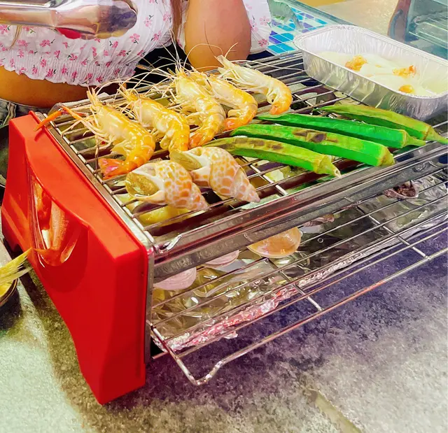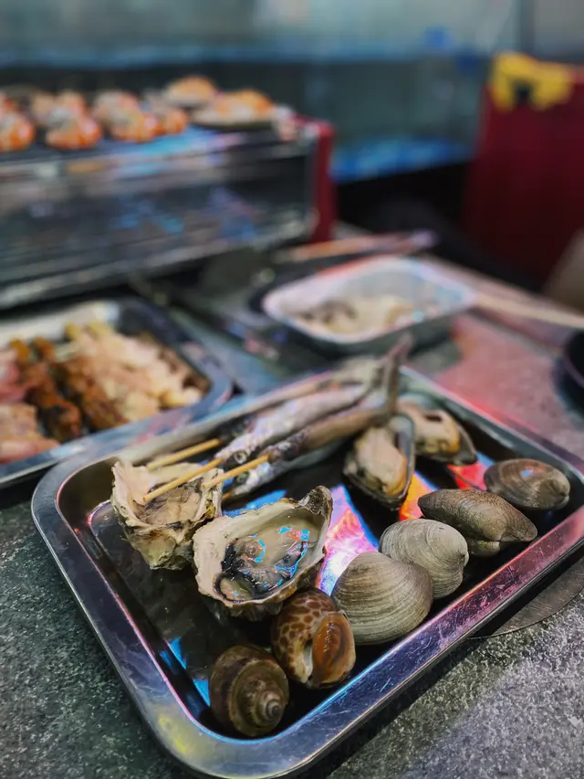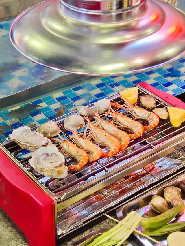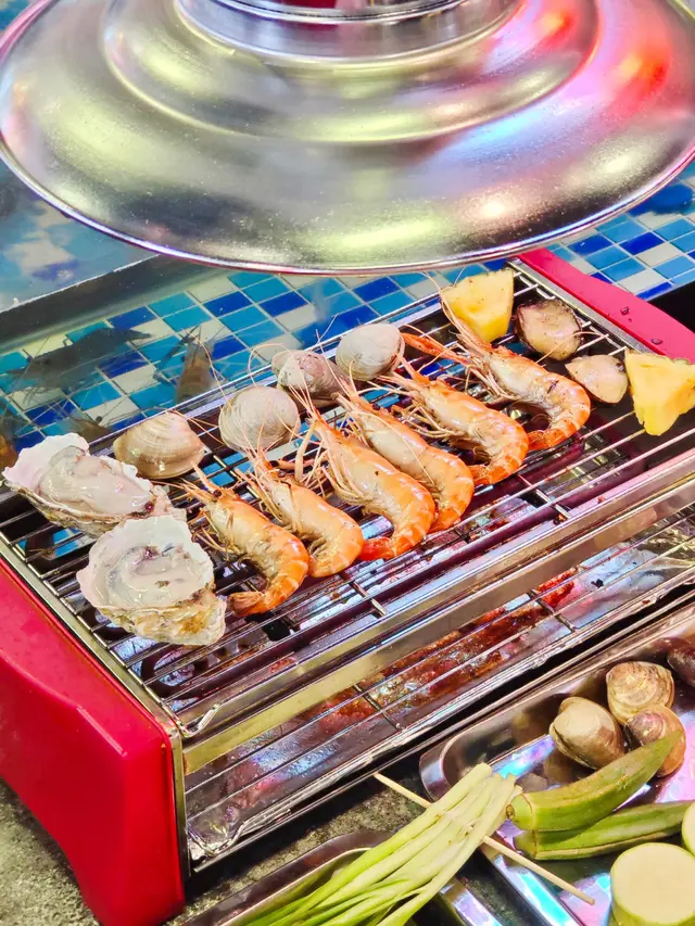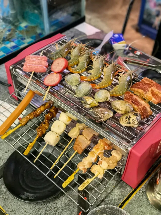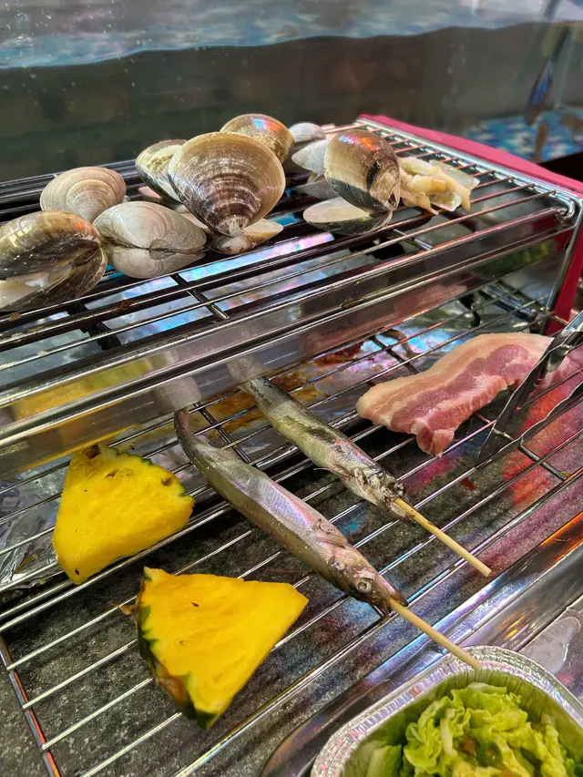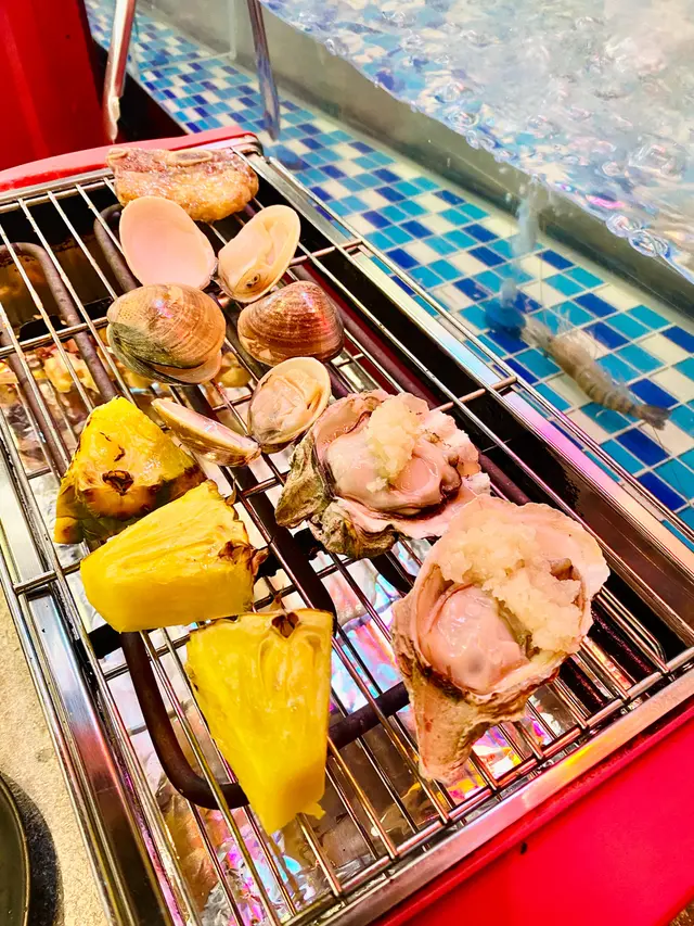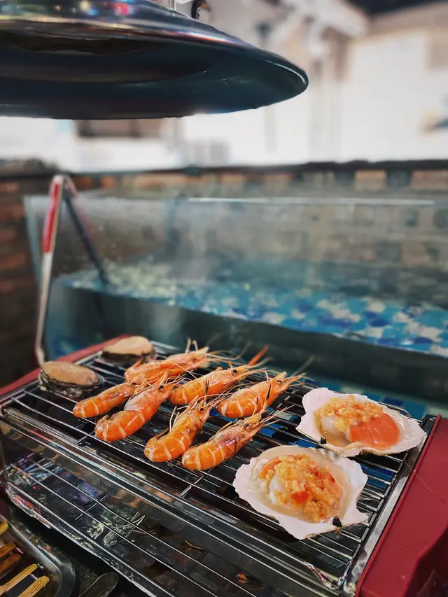 鍾意食海鮮嘅朋友,去呢間自助燒烤餐廳就啱晒啦😛。我地食早場時段,星期一至五下午五時至七時四十五分,每位成人$298。餐廳闊落、設有卡位,座位側邊有個魚缸放蝦蝦🦐,可以用夾喺魚缸即時夾起燒,超級新鮮。而每張餐枱都有通風系統,燒完冇異味。曾經都好怕去呢D燒海鮮,細細個爐覺得會燒得好慢等好耐都未有野食,呢度完全冇呢個問題呀👍🏻,因為外面放左好多前菜、熟食、甜品,而且款式都有好多,等待燒熟既途中可以出去夾吓雞翼、飲下湯,唔使怕等得耐。食海鮮最驚就係處理海鮮,成日要剝殼又要洗好煩。餐廳好貼心💕咁預先幫你處理好&調好味,亦都有整好曬一盤盤盒仔俾你成個盒燒,超方便,仲可以食到蒜蓉粉絲🤤。除咗海鮮🐟,當然唔少得雞、牛、串燒等肉類,仲有茄子🍆、粟米等其他蔬菜俾你選擇。燒到覺得熱氣唔緊要,雪櫃大量飲品俾你任飲,有菊花茶俾你下火🔥。食到飽飽哋當然唔少得甜品啦,呢度有好多款式嘅雪糕俾你揀,食完真係超級滿足呀😚。查看更多