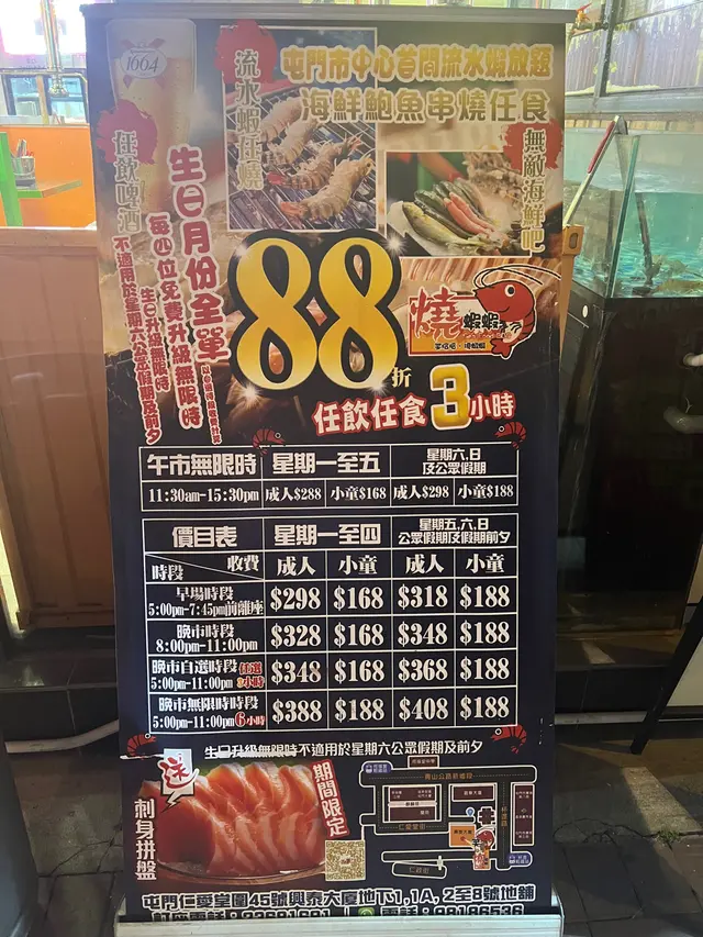🍴🍽🍴🍽🍴🍽🦐🦐🦐🦐🦐🍴🍽🍴🍽🍴🍽-發現高質海鮮燒烤放題🤩!屯門區係遠咗少少,但週末11:30-15:30無限時任飲飲食都係$298,勁抵,最有驚喜係有晒大牌子tap beer 唔洗加錢任飲,原條鮮魚同貝類海鮮任食,勁滿足,嘢飲同甜品選擇超多,好啱一家大細過嚟又玩又食。🥢 流水蝦 🆙當日見到有好多枱都帶埋小朋友嚟,佢地着住圍裙捉蝦同燒蝦玩得超high😂。蝦喺魚缸入面行嚟行去好生猛,用長鉗去夾起佢地難度唔高,再浸佢地去冰水桶整暈佢地先擺去爐燒。食得到肉質好彈牙😍。🥢 扇貝、大硯、鮑魚 🆙海鮮洗得好乾淨,喺自助區拎完可以即燒,再有蒜蓉醬令海鮮燒得更惹味。鮑魚同扇貝好大隻,肉質都好鮮嫩。另外因為有free flow清酒,加咗啲去兜硯到做清酒煮硯,加埋任拎嘅蒜同蔥花味度超香濃惹味。🥢蒜蓉粉絲鮑魚 🆙一兜入面有4-5隻剝好咗嘅鮑魚,比起連殼食嘅方便好多,加咗蒜蓉醬同彈牙嘅粉絲好正😙。🥢 串燒任拎 🆙自助區食物擺得好衛生,全部都有膠蓋遮住,最中意拎雞軟骨串、多春魚同雞腎,烤到香脆之後因應自己口味加孜然粉同燒烤粉調味,拍得住喺居酒屋食嘅味道😋。另外亦有丸類同腸仔,可以烤到咁上下掃上蜜糖,同樣好味🥰。🥢 任食粉麵 🆙 自助區有煮麵機可以快快淥個麵食,我地煮咗兩個營多,好開心😂。📌 舖頭開到深宵時份,同樣都係任食任飲,星期五夜晚同朋友嚟隊啤酒都唔錯,佢地酒杯有雪住,tap beer勁新鮮,三百幾蚊一位好抵🤩。😇評價 𝗥𝗮𝘁𝗶𝗻𝗴𝘀😇食物 𝗙𝗼𝗼𝗱 8/10環境 𝗘𝗻𝘃𝗶𝗿𝗼𝗻𝗺𝗲𝗻𝘁 7/10服務 𝗦𝗲𝗿𝘃𝗶𝗰𝗲 7.5/10性價比 𝗩𝗮𝗹𝘂𝗲 𝗳𝗼𝗿 𝗠𝗼𝗻𝗲𝘆 8.5/10整體 𝗢𝘃𝗲𝗿𝗮𝗹𝗹 7.75/10-🍴🍽🍴🍽🍴🍽🦐🦐🦐🦐🦐🍴🍽🍴🍽🍴🍽查看更多