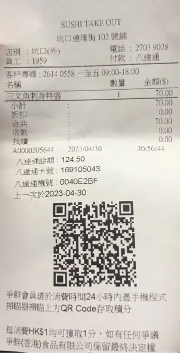 爭鮮外帶壽司 (連理街) (将军澳) 网址: https://s.openrice.com/QrLS0vyC000 地址: 香港將軍澳坑口培成路15號連理街1樓102號舖 电话: +852 27039028