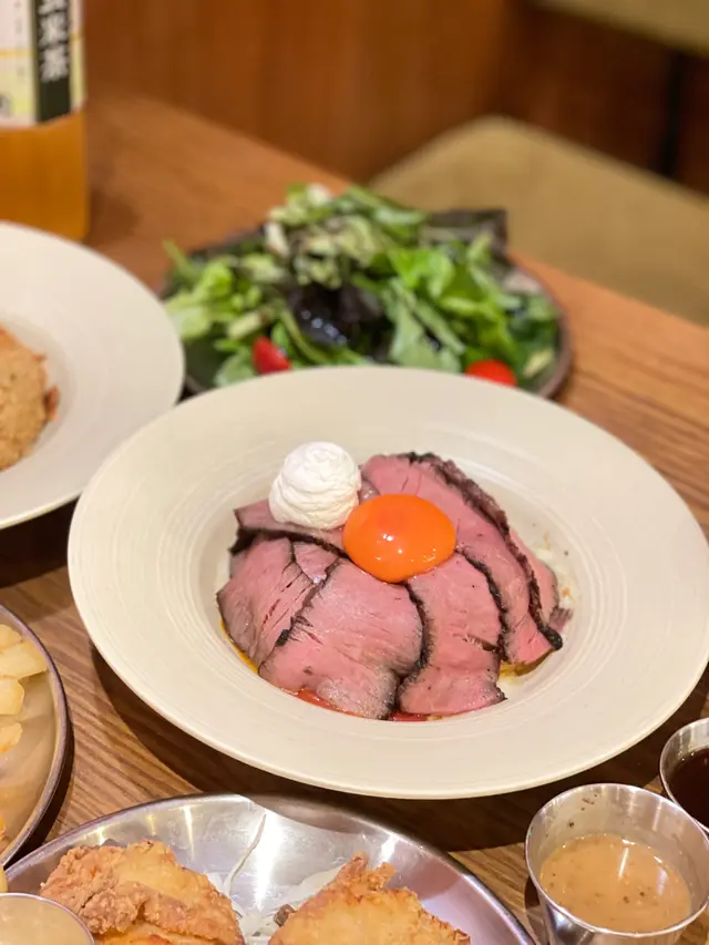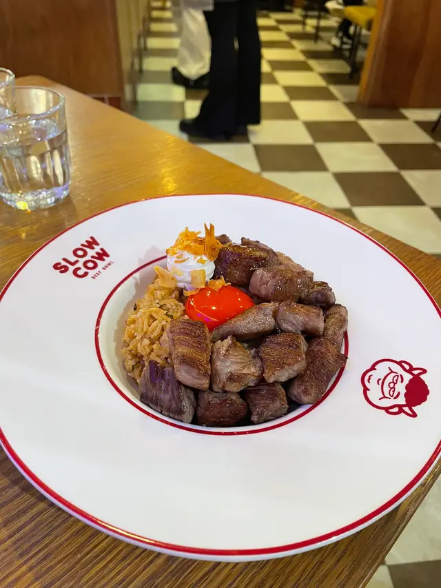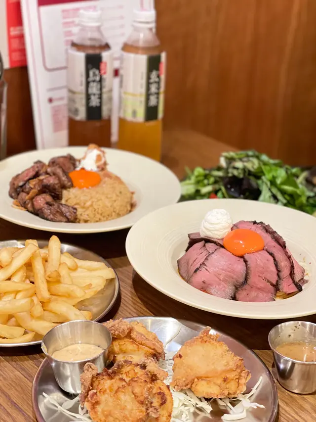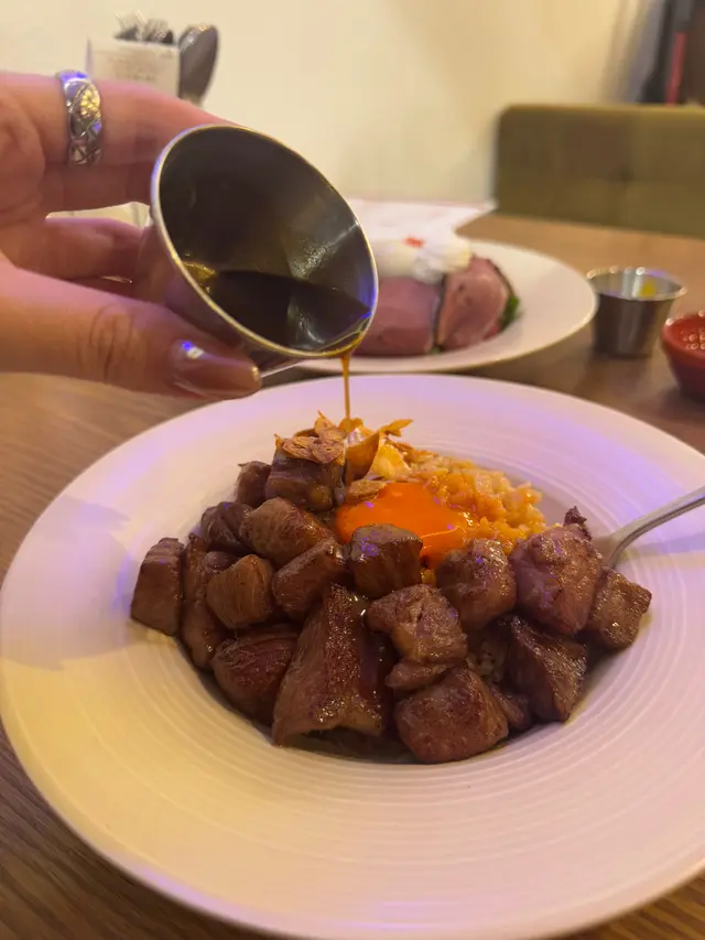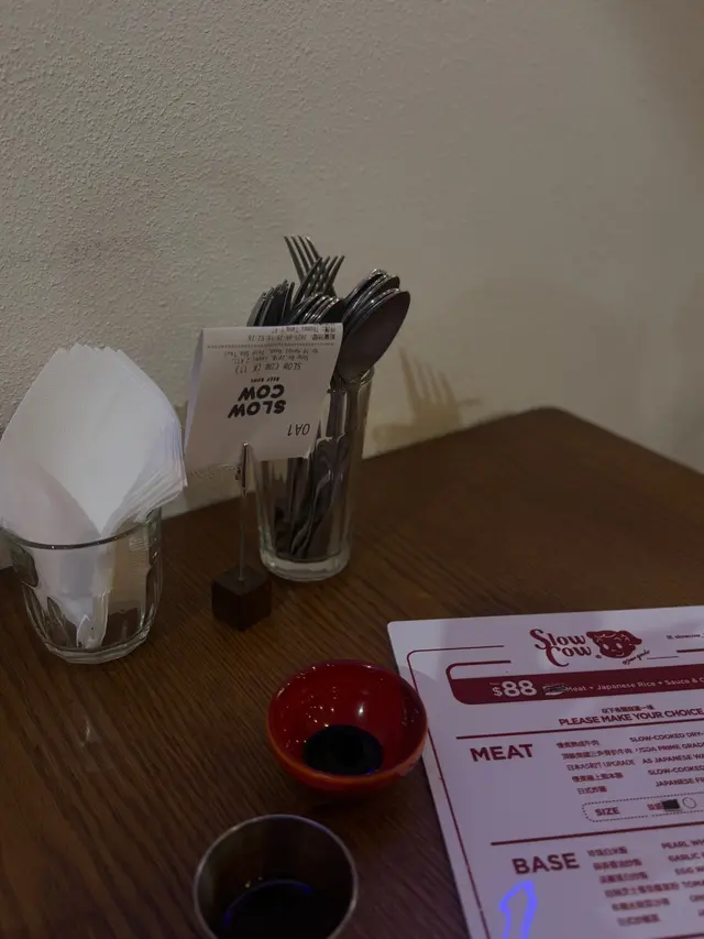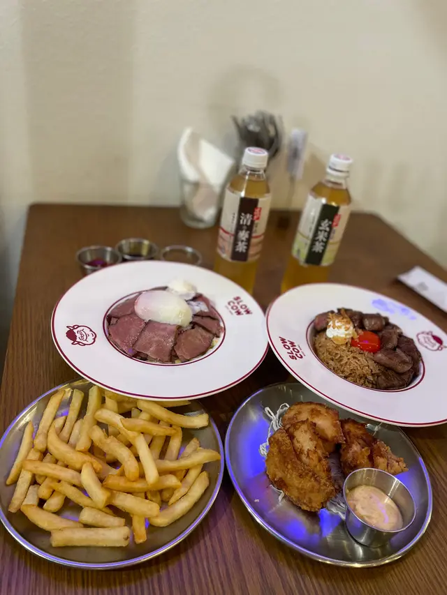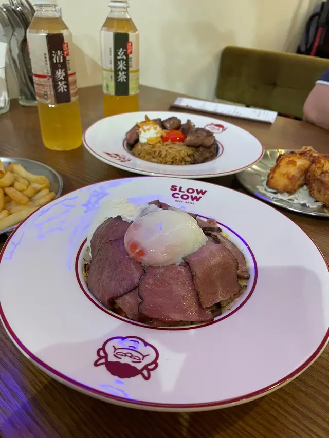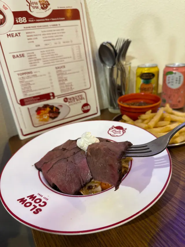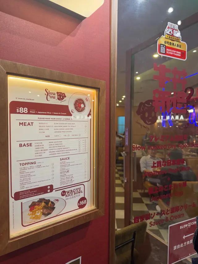 估唔到係傢俬舖入面有間隱藏專做慢煮牛肉飯的餐廳。未入去,門外已經好有美國快餐店嘅感覺。入到去簡單裝修,牆上掛住一幅U.S. Beef 的牛牛霓虹燈,亦有日本插畫大師原田治設計的公仔Osamu goods。餐牌非常整潔,容易觀看。可自行揀1款來自日本/美國出產的牛肉款式、之後選base 可選日本米、泰國米、沙律、薯條等。Topping可加不同款式的蛋,最後選一款你喜歡的Sauce。門外設計好美式、店內以木及紅色作為餐廳裝修主調牛肉款式慢煮熟食牛肉牛肉煮到淋哂又入味,慢煮真係無得輸!超多片牛肉片舖在飯上,超吸晴。非常足料,性價比高。醬汁濃郁撈飯一流。飯再吸上肉汁精華,不得了。Base: 蒜香醬油炒泰國絲苗米飯超香蒜味,好泰式feel,飯已吸收晒蒜香。好好吃。Topping: 秘製熟成牛辣肉醬辣肉醬有啲似墨西哥攞粟米片點嘅醬汁,整個醬滿佈牛肉碎粒非常之足料。Sauce:紅酒照燒汁超濃紅酒味,加入牛肉飯完全將牛提升到另一層次。A4日本和牛飯A4日本和牛飯真係味覺享受!和牛入口即化,肉質嫩滑,油脂分佈均勻,散發濃郁牛香。配上自選紅酒醬汁,味道更提升。日本飯超香煮到粒粒分明,口感層次豐富。每食一啖都超滿足,而且日本米好有飽肚感覺。絕對是和牛控的首選。Base:日本珍珠白米飯新鮮每日煮、粒粒層次分明,飽肚感很足。Topping: 秘製熟成牛辣肉醬辣肉醬有啲似墨西哥攞粟米片點嘅醬汁,整個醬滿佈牛肉碎粒非常之足料。烏龍茶/滿麥茶餐廳是提供香港著名品牌嘅茶飲…查看更多