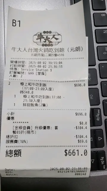 本来上网book咗星期六晚7点半同老婆 (当然仲有阿仔) 食牛大人,点知老婆临时要迟啲到,好彩同负责派枱带位的职员查询后,叫我即时攞飞补番8点。如果平时食午餐,我地会叫特级安格斯。今次晚餐就试下澳洲极上和牛。讲真澳洲和牛个卖相真系麻麻,卖相仲差过SRF或者安格斯。虽然轮牛肉的嫩滑度始终系澳洲和牛较为优胜,希望牛大人会检讨一下。除牛肉外,其他的配料选择都好丰富,老婆较钟意蔬菜类及简单海鲜类。我除咗牛肉就钟意食饺子,牛大人的饺子大把款式俾我逐啲试下。而小食方面的选择还可以,起码上枱时大部分都够热。饮品方面,我同老婆都较喜爱无糖的茶,而呢方面的选择都OK。至于甜品方面,今次Mövenpick的雪糕有2个口味,另外Haagen-Dazs就有一款雪条。职员服务方面整体令人满意,上菜的时间快捷之余亦密密帮手收走吉碟。…查看更多