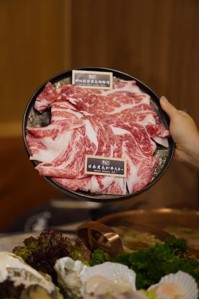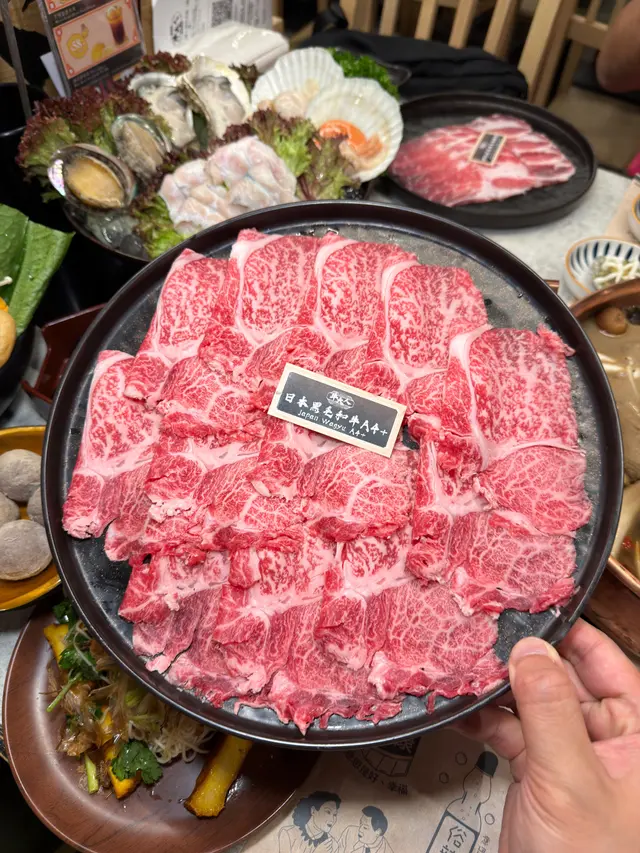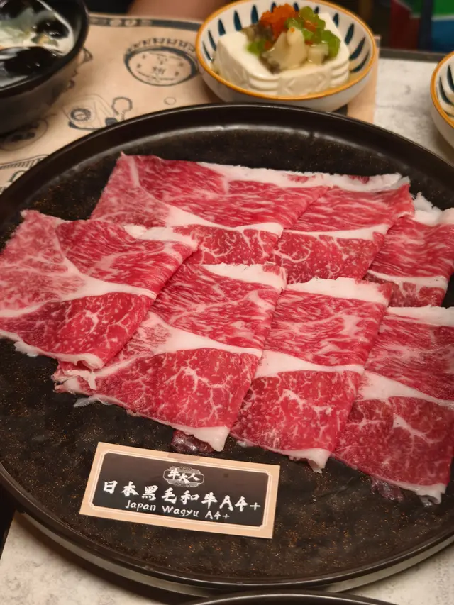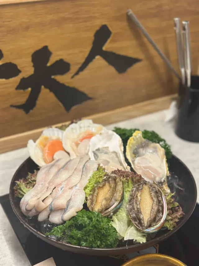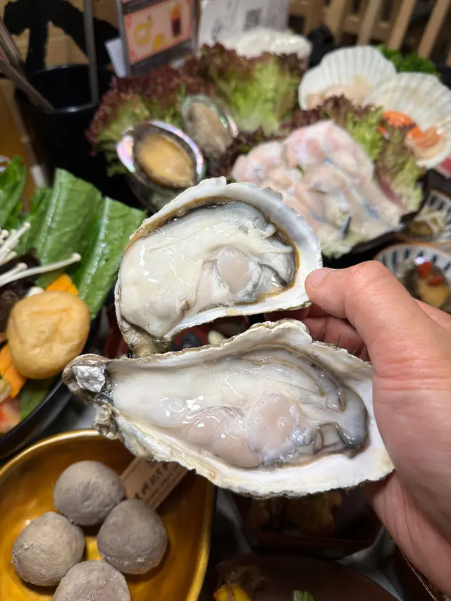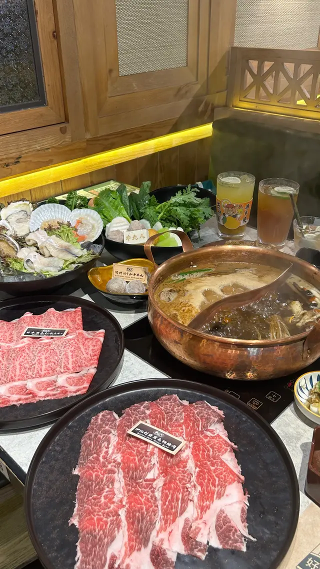 朋友知我大食帶我去食牛大人最新日本黑毛A4和牛套餐,全部上得好快超開始好豐富,果然真食到超飽😆日本黑毛和牛送M9和牛牛丸和海鮮拼盤大大碟,有生蠔鮑魚鱔片,生蠔熟咗都依然好大只脹卜卜鮮甜☺️估唔到牛丸真有傳說中彈彈牛丸感覺,我哋掛住傾計完全忘記湯內和牛,隔了幾分鐘都依然嫩滑無比,牛脂肪分布均勻,入口即溶肥而不膩,牛香味十足🤩*伊比利亞黑毛豬梅肉* 肉質細嫩多汁,味道豐富,口感層次鮮明。 即叫期間限定經典鴛鴦鍋(聰明魷魚沙茶鍋+養生菇菌燉雞鍋)茶鍋香濃帶鮮,搭配養生菇菌燉雞鍋大半只雞在湯內,味道層次豐富,2款既有濃郁也有清淡,食得好自在。 驚喜嘅多款特色鮑魚料理(美乃滋鮑魚酥、柚子燒汁鮑魚、古法醉鮑魚)有多款創新做法,美乃滋鮑魚酥外脆內嫩,柚子燒汁帶清香果味,古法醉鮑魚醉得入味又保留鮮甜。吸引到我仲有懷舊系列菜式-*和牛橘梨豆腐*酸甜配合得好,相當開胃🤤*蝦蝦霸霸脆多士*香脆彈牙而不油膩👏*阿嬤豆乾魚蓉面*感覺好地道,又帶住濃濃嘅傳統風味,仲有豆乾好滋味,魚蓉炒麵味道滿足!而且份量啱啱好好有心思。*烏金墨汁手作腸*香濃又創意,墨魚🦑彈牙。其他仲有三和夜市雞皮卷、海苔鹽酥雞、夜市撈脆薯等懷舊味道同新潮做法結合。 特色甜品芒檸蜜西米爽清新又解膩,蜜桃愛玉冰同伏特加特調嘅港式檸檬茶18+,有果香又有酒香,非常配搭。還有好多台灣直送的蔬菜都好新鮮,餐廳調味醬料非常廣泛。走時候服務員叔叔溫馨提示我食雪糕,我哋九秒九去拿,飽都要食🤣…查看更多