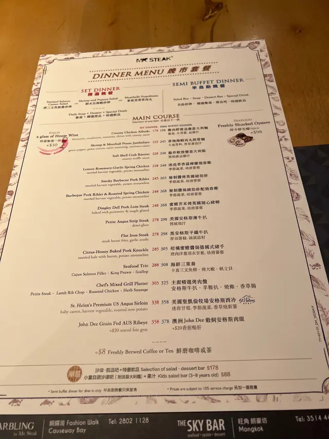 Mr Steak出名食Semi Buffet ,而且牛肉都有一定水準,咁啱佢哋近排晚市推出和牛嘅套餐,仲要$498買一送一,於是就試一試佢,所有套餐可以加配成半自助晚餐,享有自助沙律吧、餐湯同甜品吧任食🤓❣️日本JA全農和牛嘉年華 $498     📍日本和牛威靈頓         和牛油脂感勁重,咬一啖成個口就充滿牛油嘅味               道,感覺上有啲油膩🥸,反而旁邊嘅配菜有驚喜,         松露薯蓉同芝士焗茄子好味😆     📍日本和牛味噌燒         和牛七成熟,牛味勁濃,旁邊嘅蕃茄本菇意大利飯          都充滿牛肉嘅香味,呢個菜式就十分推介👍🏻❣️雞肉野菌忌廉意大利麵 $198整體感覺較為乾身冇咩汁,忌廉較少,雞肉較鞋,唔推介🥸❣️迷迭香香蒜檸檬燒春雞 $248春雞味道都入味,正常發揮❣️秘制醬烤英國豬肋排 $265豬肋排燒得較乾,醬汁偏濃味🤪👅好味度:8(10分滿分)沙律吧嘅沙律新鮮,加上期間限定嘅和牛餐,性價比算ok😎🏦是次消費總額 $1329.9(人均消費 $266)    🍴須加一服務費…ดูเพิ่มเติม