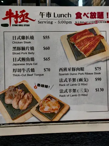日式自助石烧牛扒店,牛扒有不同部位及重量选择,均经过熟成处理,会由师傅先煎至一成熟,再放在摄氏300度的火山石板上,客人可按喜好自行用石板烧至理想熟度。牛扒餐皆附自助吧,可任食沙律及饭。