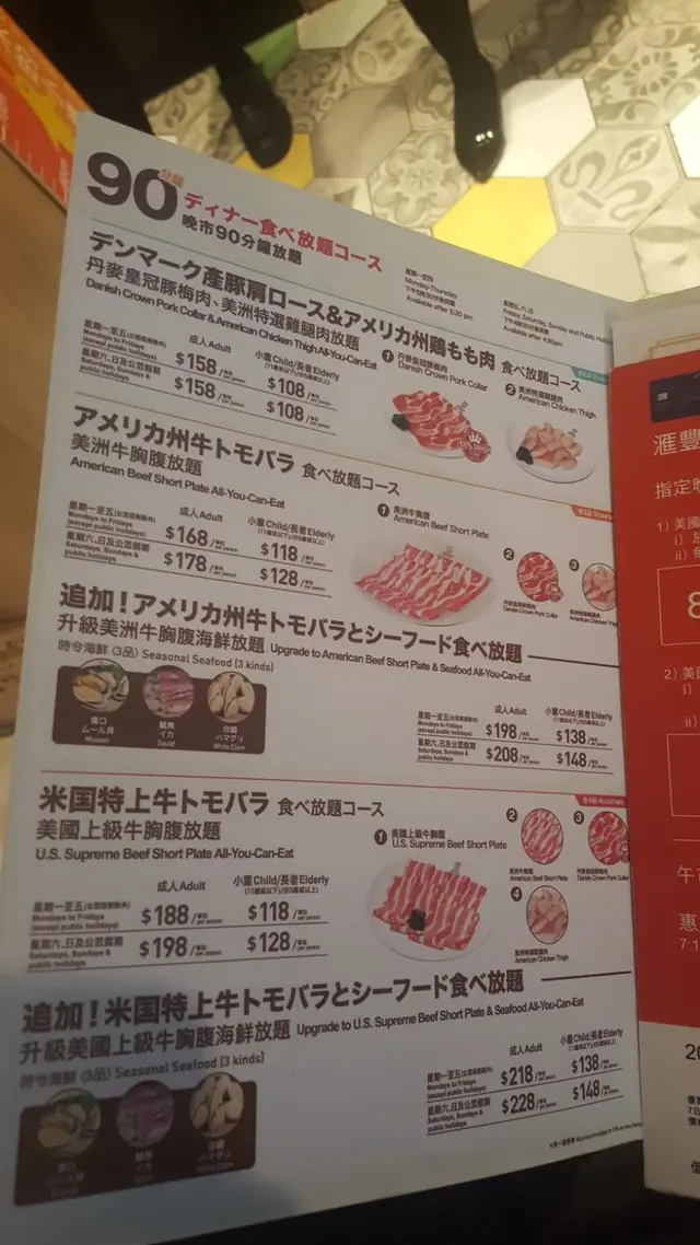 晚巿90分鐘放題,次次去都多人等,可book位。貴有貴食,平有平食,唔同級數唔同價錢。💰LV1 $158 至LV5 $268,海鮮加$20-30不等。肉類,自助吧食物,飲品,甜品,都係任食!.🔷LV4 美國SRF和牛放題($228).🔸湯底:甜醬油湯,蕃茄濃湯特別推介甜醬油湯⭐️,味道似壽喜燒。最近仲有抗疫推介限定,加入抗疫食材:杞子,紅棗,鮮百合,雪耳,蟲草花。.🔸SRF和牛⭐️啲油花望落幾靚,食落幾腍,好食,仲要任食,梗係唔客氣狂嗌啦!.🔸丹麥皇冠豚梅肉都幾腍,薄薄地,脂肪分怖都唔算差。.🔸美國上級牛胸腹🔸美國牛胸腹呢兩款係低級數啲嘅牛,各嗌左一碟。唔差,冇和牛咁正,冇繼續嗌。.🔸美國特選雞腿肉唔鐘意,雞件吸唔到湯底既味,唔太喜歡烚雞。.🔸各式甜品,牛奶雪糕,西瓜雪糕特別想講個和風大福⭐️,外面有綠茶粉,口感好掂,好軟熟又有點黏黏糯糯。.🔸各式丸類,豆製品🔸各式蔬菜,沙律🔸各式汽水,果汁,飲品🔸稻庭烏冬,拉麵查看更多
