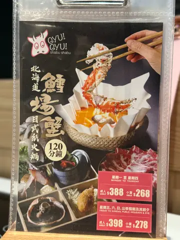 之前黎食过觉得唔错,趁假期再嚟,点了日式雪场蟹纸火锅放题最钟意呢度一人一锅,8款汤底中拣左传统山椒味噌、泰。酸辣虾味道,少少辣鲜味开胃!饮品除咗雪柜入边嘅罐装汽水、茶,sake、红白酒都有。趁汤底煮滚前,先食套餐随付既四重蟹盛宴,四宫格里分别有金黄香脆多蟹肉酥炸蟹钳、蟹汁鲜甜蛋滑松叶蟹脚茶碗蒸、味噌松叶蟹膏甲罗烧,蟹羔creamy浓郁,爪肥爆肉红帝王蟹脚,非常吸睛!尝完蟹宴四品时间啱啱好,可以灼肉食,套餐有多款部位可以点,首选追加澳洲黑安格斯牛肩胛、澳洲M6和牛,薄切夹起唔零碎,肉嫩大片牛油香滑!封门柳肉味浓,牛舌爽口Juicy,牛小排红润鲜味,另有草原膻香羊肩,伊比利亚猪挴片,肉味清香,配山椒味噌汤好夹,肉味瞬即提鲜!扫Code可以order海鲜配料,半壳鲍鱼好鲜、起胶多馅明太子墨鱼滑、青口、肉爽海扇贝、越南凤尾虾,放泰式酸辣虾汤鲜味大放送日式章鱼烧波波配烧酱汁一流甜品 有榴梿皇炸弹,仲有自助区嘅糯米糍、生果。真系够丰富又满足。…查看更多