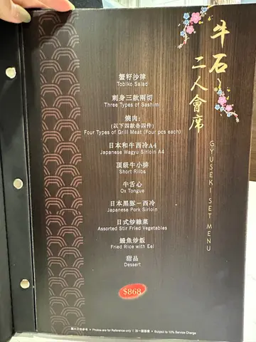 🔮澳洲龙虾两食 $338🔸️刺身+龙虾汤 (加$50可转龙虾粥)绝对系激安推介呀~原只游水澳洲龙虾,即开起肉切片,龙虾肉超新鲜呀!大大只上台超有气势,上枱时龙虾触须仲会郁的,龙虾肉晶莹剔透,入口鲜甜都不得了,又弹牙,虾味鲜甜,简直齿颊留香呀~太后都系度劲打卡刺身食完之后,侍应会拎番个龙虾头俾厨师熬龙虾粥,大概熬煮45分钟左右,虾粥上台时竹香味十足,一啖入口,虾味十分浓郁且鲜甜,粥底又绵滑,龙虾膏完全溶入咗个汤粥底入面,仲有粒粒虾肉,我同太后边食边赞呀~绝对一试难忘呀!仲要两食都只系$338,坚抵呀!!我地点咗个二人餐,有我钟意嘅鱼生刺身,又有太后钟意嘅烧肉,份量绝对足够两人食有多呀~🔮二人会席 $868🔸️蟹籽沙律先来头盘沙律,海量的蟹籽和青瓜丝,蟹柳丝我,清新开胃🔸️刺身三款两切厨师真的很佛心呀,全部刺身都是厚切的,大大块好吸晴呢~🔹️三文鱼:鱼脂分布平均,有入口即溶之感,非常新鲜🔹️北海道元贝:大粒又厚身,新鲜鲜甜,元贝味很浓郁🔹️油𫠐鱼腩:入口甘甜,每啖都充满著鱼油香,又自带一种爽口的质感🔮烧肉 (每款各4件)食完刺身,侍应便会预热烧烤炉,炉旁有个强而有力的抽风烟通,唔怕食到成身烧肉味,烧肉拼盘底部放了一些干冰,上枱时烟雾蒙眬,真系好有排场呀!太后见到心心眼,即刻手机先食呀~🔹️日本和牛西冷A4: 牛脂丰富,清楚见网纹分布非常密集,西冷入口即溶,牛油味甘香浓郁,真系好正呀~🔹️顶级小牛排:轻轻烤半分钟,甘香的牛味已扑鼻,入口牛香无比,肉脂均匀,牛肉味丰腴,再蘸少3少烧肉汁,更加惹味呀~🔹️牛舌芯:肉质十分软腍,爽口滑嫩,牛味浓郁又juicy, 烤完再蘸少少盐巴更提牛鲜味呀~🔹️日本黑豚-西冷:肉香质地十分软熟,带点爽弹口感🔸️日式炒杂菜食完甘多肉,来个蔬菜平衡一番,以日式酱油和调味料来爆炒,镬气十足,蔬菜新鲜又爽脆,且大大碟,份量确不少呵🔸️鳗鱼炒饭厨师功架了得,炒饭不但味道恰到好处,更炒至粒粒分明干身,非常香口,又有鳗鱼粒香味口感,真心赞🔸️甜品最后来个日本直送大坂豆腐雪糕和蜜瓜雪糕,这餐真的大满足呀!餐厅仲做紧幸福轮推广,每枱客人都可以玩幸运轮抽奖,一定有奖,大奖更有日本清酒1.8L一支,而我就转中牛小排4片来加料,都唔错呀~