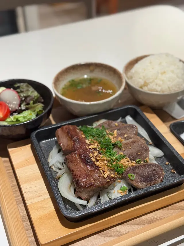 以前依個位都係人氣Cafe黎嘅,最近變咗專做牛舌嘅牛舌專門店,作為牛舌愛好者梗係要第一時間上去試吓😎 食完覺得水準非常之高👍🥢 原條重量牛舌芯佐牛舌尖 $146一上枱已經好吸引✨ 牛舌鋪滿成個鐵板🔥 底下一大堆洋葱絲,食落清新又解膩🍃牛舌尖 非常之軟熟💛 又有濃郁牛舌香味🐮點柚子醬油即刻多咗陣清新🍋 用少少海鹽又可以帶出牛舌本身嘅鮮味🧂而另一條牛舌芯厚厚地✨ 邊位微焦睇落都知係 有返咁上下質素🔥 🔥 極・厚重量炙燒牛舌芯 $156呢款真係全場焦點💥 大條到好似食牛扒咁😳咬落去 爽彈口感一流💥 牛香 非常之突出🔥 油脂比例啱啱好唔會膩💛配日式芥辣好醒胃🌿自家製蔥油我覺得拌飯會好食啲🍚 用嚟配牛舌就一般👀🍲今次我哋兩個餐都有升級(湯+沙律)洋葱牛舌湯好清香🍲 有淡淡嘅牛味🐮 好似簡單版牛骨清湯而沙律蔬菜都算新鮮🥗 整體交足功課👍作為牛舌專門店,佢哋最重要嘅牛舌真係做得好好✨味道夠🔥 賣相靚📸 厚切爽彈💥 牛香濃郁🐮,有時專注做好一樣嘢反而更突出,可以令到食客更加留下深刻嘅印象。查看更多