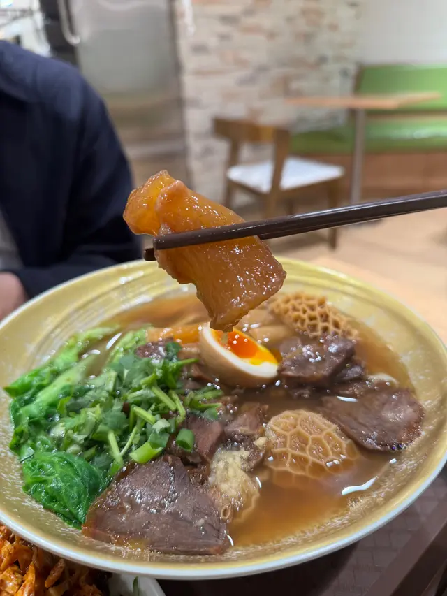 收工經過想快左個飯就番屋企,經過Aeon見琴呢間牛麵,天氣凍凍地想食熱湯就試下。沙茶牛三寶湯麵 有驚喜, 金錢肚爽脆入味、牛筋厚肉有咬口、牛腩軟嫩不柴,沙茶與牛骨湯底幾融合而且唔膩,刀削麵彈牙有嚼勁,而且份量大!手工去皮炸雞扒湯麵,雞扒去皮,所以直接食琴肉質,算係有肉汁唔柴。小菜方面,蒜泥白肉薄切蒜香辣醬油提鮮不搶戲,辣醬係偏甜少少時味道,肉質細嫩不乾柴,層次分明。整體湯頭、麵條到配料見用心,份量十足且價位合理,性價比不錯,埋單200$, 人頭$100有找…查看更多