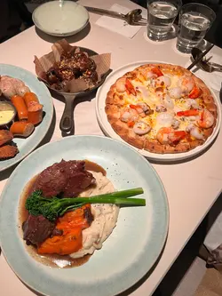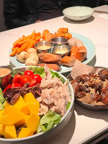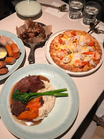今天在铜锣湾约了朋友聚会,环境不错,上层卡座私隐性更高,聊天方便✨餐牌有很多选择▫️芒果牛油果鸡排沙拉鸡排蛮好吃的,菜也很fresh▫️小食拼盘份量很足,有些炸物和蕃薯条,还有三款酱可以选择▫️小啡菇很juicy,不过不失▫️海鲜pizzapizza很脆口,海鲜份量也足够▫️炖牛颊肉肉很嫩,很多骨胶原。薯蓉拌菜也很好吃▫️tiramisu比想像中大杯,跟传统tiramisu不太一样,里面有咬口的朱古力碎一天前提前订位,当日餐厅会打电话确认booking。整体不错~