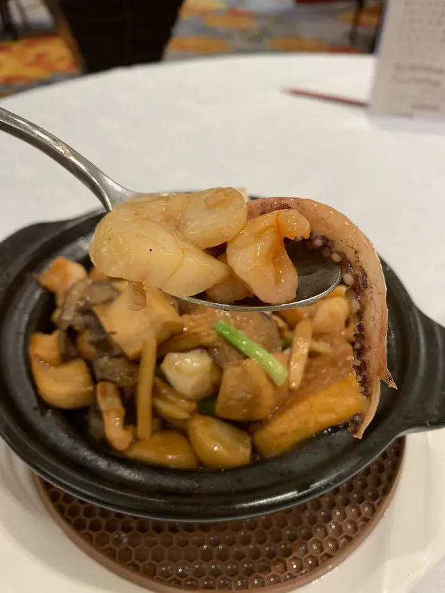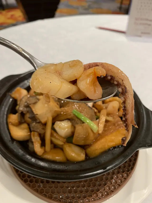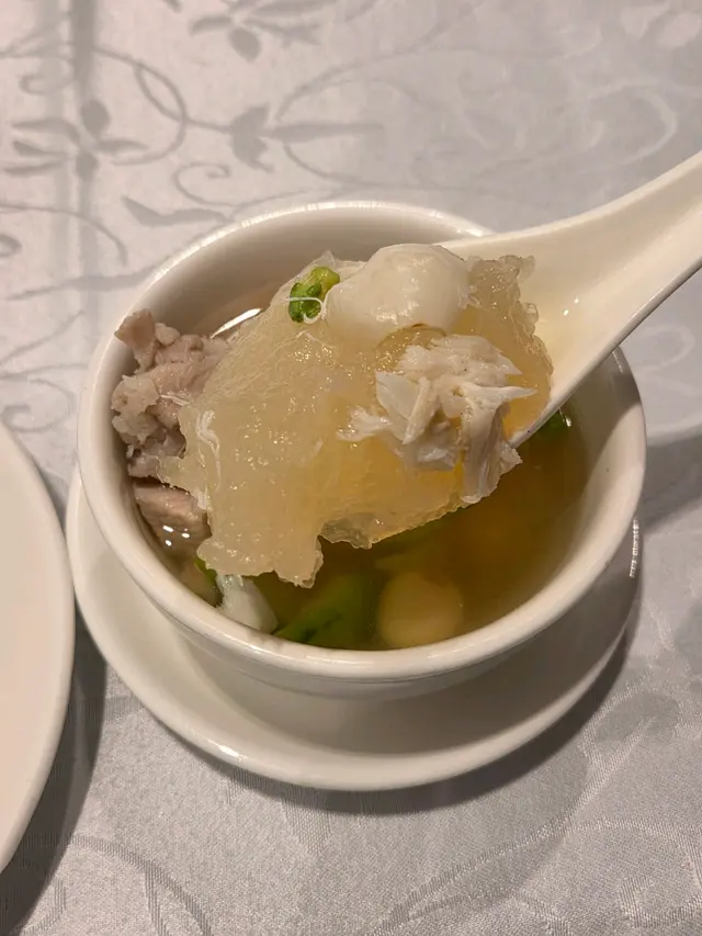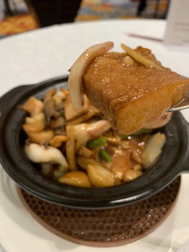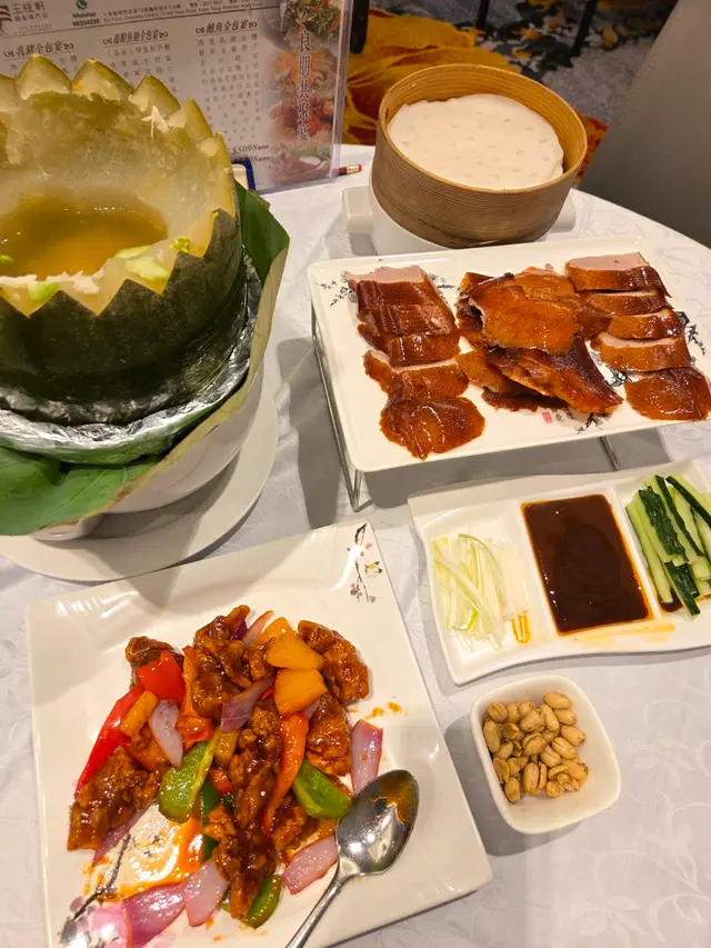 今次係媽媽帶我去食好嘢佢經常晏晝喺呢度飲茶,見到晚餐都好抵食有多款套餐同升級孖寶今日揀咗片皮鴨自選組合一份片皮鴨加一個自選小菜只係$388 ,份量都唔少㗎一共有10多個菜式,選擇我哋揀咗菠蘿咕嚕肉首先係招牌片皮鴨師傅會推隻鴨喺你旁邊片鴨除咗薄既片皮鴨,另外師傅有啲片咗皮+鴨肉鴨皮脆而不膩,鴨肉鮮嫩多汁,蘸上特製甜麵醬,再配埋青瓜大蔥,用熱辣辣嘅薄餅皮包住食佢嘅薄餅皮係連埋蒸籠一齊上keep住熱辣辣,趁熱食特別好味菠蘿咕嚕肉金黃酥脆既豬肉裹著晶瑩剔透既糖醋汁,配上新鮮菠蘿、青紅椒非常夠鑊氣,好難得放涼咗依然保持酥脆,肉質鬆化不柴,酸甜岩岩好,好開胃嫩滑既豆腐吸咗鹹魚既鮮香與雞肉既甜美,三款不同質感嘅食材口感層次豐富鹹魚嘅鹹鮮味提升咗整個風味,又唔會過於搶戲雞粒鮮嫩多汁,豆腐入口即化一定要送白飯見到隔籬枱叫咗冬瓜盅好大個下次嚟都要試吓查看更多