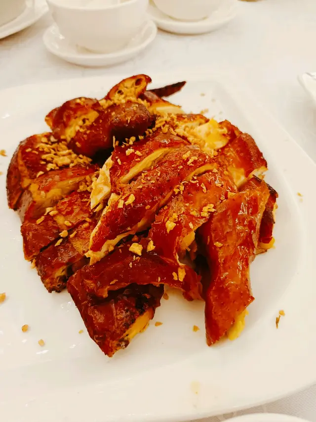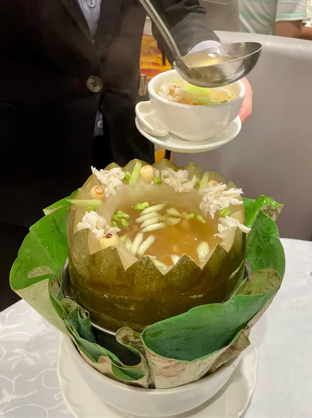 觀塘既是工業區,也是美食集中地,飲食上有很多選擇,來到鱷魚恤中心,大家想到玉桃軒吃晚飯,這間茶樓樓底夠高,裝修清雅,水晶燈繽紛閃爍。海皇八寶冬瓜盅 天氣暑熱,食個冬瓜盅可以說是消暑的湯品,以冬瓜作為容器,用料很豐富,以海產為主,蝦仁、蟹肉、螺片和瑤柱等,充滿海鮮的鮮美,冬瓜肉口感清新,加上肉粒和蓮子等,不同配料帶來多樣的口感體驗,層次感豐富,份量多又足料。脆皮蒜香雞半隻這道菜色香味俱全,雞件外皮好酥脆,雞肉鮮嫩多汁,蒜香味道濃郁,香氣四溢,令人回味。豉汁涼瓜炒牛肉炒得好有鑊氣,涼瓜鮮甜爽脆,牛肉嫩滑鮮味,加上豆豉的鹹香味,為這道菜增添了層次感。涼瓜吸收了豉汁的風味,充滿濃郁的味道,搭配牛肉的鮮嫩,美味可口。查看更多