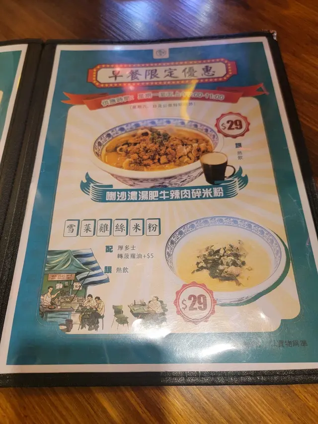 今日時間尚早可以食過早餐先開工早餐限定都幾抵29蚊有2個餐揀1)喇沙濃湯肥牛辣肉碎米粉+熱飲2)雪菜雞絲米粉+厚多士(轉菠蘿油加$5)十熱飲叫左個B餐可以選2款餸另外加左$3要多隻煎蛋兩款餸要左沙茶牛肉絲同餐肉粒配米線。牛肉唔韌,餐肉粒雖然浸左落湯,但食得出脆面。連熱飲$41...算好。搵日再黎食晚飯先查看更多