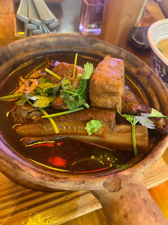 送完朋友機就去咗青衣搵食估唔到又發掘到一間好餐廳Order:二人餐(砂煲肉骨茶、海鮮蝦粉麵、麻辣口水雞、藥膳浸菜、串燒x2)砂煲肉骨茶的特點是超級入味的金菇、豆卜、腐皮和滿滿的牛肋骨,配上豐富的配料。這些材料使得湯頭入味且足料,吃起來非常美味!海鮮蝦粉麵也是一道推薦的菜品,它帶有香氣,並且不辣,非常適合喜歡清爽口味的人。尤其是大隻的蝦子,給這道菜增添了豐富的海鮮風味。麻辣口水雞是一道四川菜,但它的麻辣口味並不過重,容易入口。這道菜的雞肉十分滑嫩,給人口感上的享受。我們叫了牛串燒,有著香脆的外皮和炭燒的風味,咬下去的口感非常讚,並且不會太柴,肉質也十分嫩滑。最後是藥膳浸菜,這道菜的特點是藥膳味道濃郁且帶有新意。整體上仍然能夠為餐廳的菜單增添多樣性。總體而言,這家餐廳提供了多道美味的菜餚,其中牛串燒、肉骨茶、海鮮蝦粉麵和口水雞都是推薦的菜品。如果你喜歡豐富口味和炭燒風味的菜餚,這家餐廳絕對值得一試。查看更多