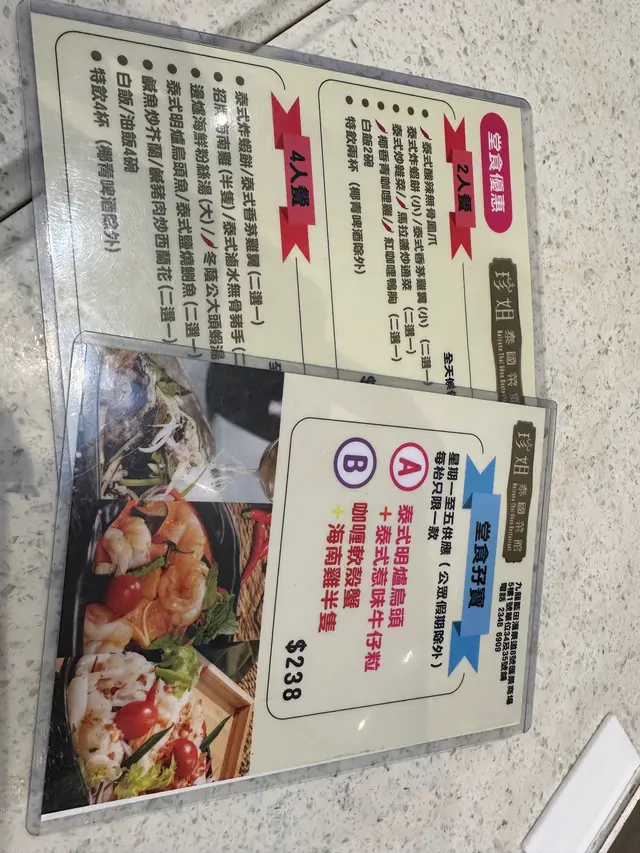 呢個廚師精選套餐份量真係非常之多,話就話四人餐,但係我哋四個人根本食唔曬。先嚟兩個小食,分別係泰式酸辣無骨鳳爪同埋泰式炸蝦餅。馬拉盞炒通菜同埋泰式炒雜菜可以二選一,我哋揀咗馬拉盞炒通菜。跟住可以揀半隻海南雞或者泰式豬手,我哋揀咗海南雞,隻雞都幾靚而且唔係好肥,啲雞肉都幾滑。跟住仲有一條魚,可以揀泰式明爐烏頭或者鹽燒鰂魚,我哋揀咗鰂魚,個侍應好好人,知道我哋叫呢個餐就即刻問我哋會唔會叫燒魚,因為條魚要燒差唔多45分鐘,所以如果我哋叫鹽燒鰂魚就即刻叫師傅開始燒,認真細心。條魚都幾厚身,所以好處就係大條,唔好處就係好難燒得夠乾身。跟住仲有一個咖哩炒蝦球,蝦球都ok不過我想講佢啲配菜嘅味道畀蝦球更加出色,尤其是佢啲洋蔥青椒撈咗咖哩汁真係好正。主食就可以揀蒜蓉包或者印度薄餅,我哋要咗印度薄餅,呢個就一般啲,其實我覺得應該配白飯更加正,話曬都有咁多餸送飯。呢個餐竟然仲有甜品,就係芒果糯米飯,佢嘅芒果糯米飯都整得幾好食。最後梗係有飲品四杯啦,叫特飲竟然唔使加錢真係好開心,呢度個珍多冰同埋龍眼冰都正,尤其是龍眼冰竟然畀咁多龍眼,呢個餐真係超值。…查看更多