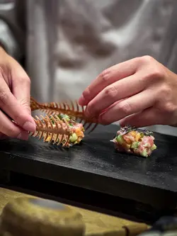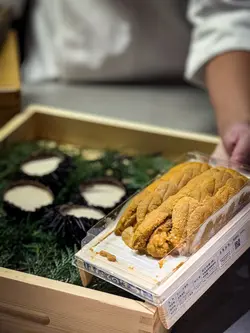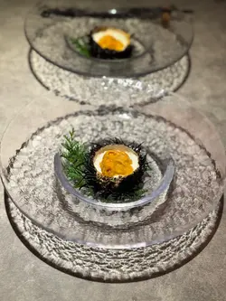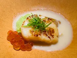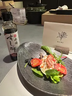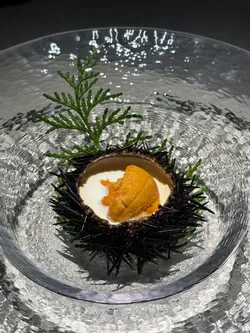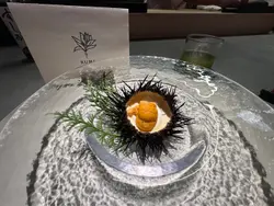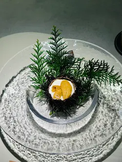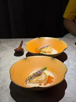 最近先發現北角呢條街幾多隱世美食,呢晚就嚟咗呢間新開嘅法日料理,食個十道菜嘅tasing menu😎魚脆片造型特別,魚形狀嘅脆片其實都係用鯖魚肉整成,中間夾雜咗拖羅蓉同埋意大利酸豆、青瓜同埋蘿蔔,口感同味道都好特別🐟3年熟成赤酢布拉塔芝士完全冇諗過芝士同赤醋可以咁夾,用上3年熟成嘅赤醋,食落口幾有風味🧀 連側邊嘅車厘茄都有師傅嘅心機,有先漬過,更加突出個酸味🍅原隻北海道海膽蒸蛋係個凍食嘅茶碗蒸,入口勁creamy🙈 最鍾意佢用上兩種海膽,有紫海膽整成嘅茶碗蒸,加埋面頭嘅赤海膽,一個菜式有兩種海膽嘅鮮甜🥰帆立貝拌牛油果蓉輕煎過嘅帆立貝,配埋鮮磨嘅牛油果蓉同埋柚子醋醬,連三文魚子都用柚子皮漬過,入口特別fresh🤩 加埋有柱貝熬成嘅湯,更加可以為帆立貝提鮮。炭燒日本鮮秋刀魚第一次食半生熟嘅秋刀魚,入口幾肥美,面頭燒到微焦嘅魚皮係用上備長炭輕輕燒過,更有風味😙 配有秋力魚肝醬及煙燻紅椒粉同杏仁醬汁,配埋一齊食就更加正。鵪鶉髀伴雞肝醬白菌外層係香脆嘅餃子皮,入面嘅鵪鶉髀已經拆咗骨,配埋雞肝醬炒香咗嘅白菌,都幾有風味。仲可以點埋用法式高湯雞汁同山吹醋整成嘅醬汁😍 鮑魚手工扭指麵賣相超吸引,有個大大嘅鮑魚殻裝住,超有儀式感😝 面頭嘅係北海道嘅蝦夷鮑魚,配埋鮑魚肝醬,每一粒手工嘅扭指粉都有醬汁掛係上面,入口彈牙有口感🥳拖羅太卷一啖大滿足,入面有拖羅、新鮮青瓜、煙燻蘿蔔。鮮松茸地雞湯呢個雞湯味道清清地,有燒過嘅新鮮松露係入面,更加重菇菌嘅香味🍄🟫甘味甜品方面係自家製迷迭香嘅雪糕🍦配上焦糖炒香咗嘅榛子同埋蜜柑醬。如果坐吧檯嘅話,可以望住師傅整同傾吓偈,感覺更加正 。呢度嘅Sake同氣泡酒都係seasonal㗎,有興趣嘅朋友可以過嚟飲返杯🥂…查看更多