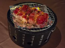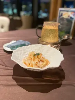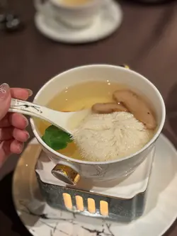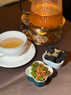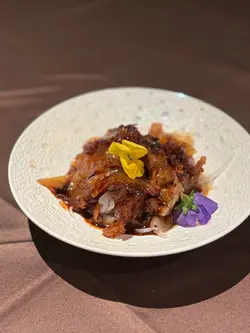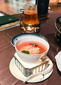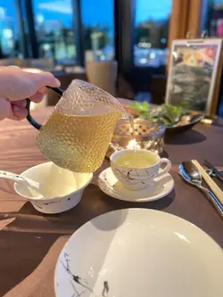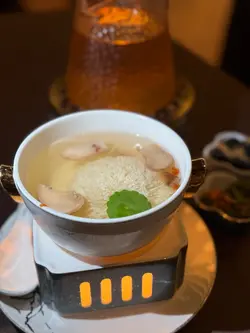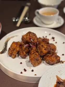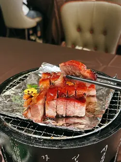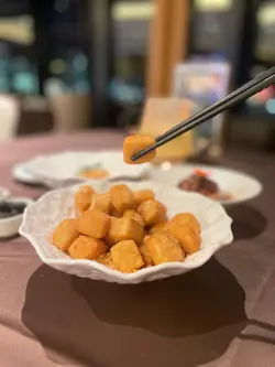 同男朋友喺西九文化區漫步後,嚟到呢間隱藏於文化園內嘅高級粵菜「璞」。全場樓底空間感足,仲有唔少人嚟包場辦宴會,氣氛優雅浪漫。今次試咗多款精緻菜式,人均$879,每道都係視覺與味覺嘅雙重享受!🌟 環境與服務· 宴會級場地配落地玻璃,望到西九夜景· 職員專業有禮,會詳細介紹每道菜· 茶位用蠟燭保溫,優雅得嚟保持茶溫🍖 礦物質叉燒 ($268)|視覺系主打用西班牙黑豚肉製成,部位偏瘦但唔韌。上桌時用迷你炭爐保溫,炭香隨白煙飄散!最特別係配紫蘇葉包住食,清新香氣中和叉燒嘅蜜糖甜,創新得嚟又解膩~🍄 松茸菊花豆腐 ($198)|功夫之最將嫩豆腐切成盛放菊花形,每條幼度均勻!湯底清澈見底卻暗藏玄機——松茸香氣完全融入湯中,飲落鮮甜回甘,豆腐入口即化,簡單中見功力!🥣 花膠酸辣湯 ($236)|溫柔新演繹將傳統酸辣湯改良,辣度與酸度減至三成,突出花膠絲、木耳絲同肉絲嘅鮮味。湯質濃稠滑溜,花膠份量足料,口感豐富又養生~🥗 柚子醋海蜇花 ($88)|開胃前菜選用海蜇最爽脆嘅「花」部位,配自家調製柚子醋。酸度明亮清新,唔似日式偏甜版本,更能帶出海蜇嘅海洋鮮味!🍗 法蔥油脆皮炸雞 ($328)|驚喜之作去骨雞件炸出玻璃脆皮,蘸上法蔥與花椒調製嘅醬汁——蔥香中帶微微麻感,卻唔會辣口!雞肉保持嫩滑多汁,伴碟炸金蒜更添香口~🦞 龍眼肉泡勝瓜 ($228)|鮮甜極致用龍蝦頭熬製湯底,濃郁卻唔厚重。勝瓜切成整齊小段,吸收湯汁後依然爽脆。龍蝦肉彈牙鮮甜,湯汁可以直接當湯飲,鮮味縈繞不散!🍧 甜品雙重奏· 陳皮紅豆沙:綿滑起沙,陳皮香若隱若現,甜度恰到好處· 蔷薇燕窝奶凍:用上完整燕盞,絲絲分明。奶凍香滑顫動,奶香優雅不搶戲💎 整體評價▪️ 環境:宴會級裝修,浪漫氛圍滿分▪️ 服務:細心專業,會因應用餐節奏上菜▪️ 食物:傳統粵菜加入創新元素,每道都見心思▪️ 價錢:高級餐廳定位,質素對得起價格今餐體驗絕對難忘,特別係菊花豆腐同法蔥炸雞展現嘅廚藝功力。推薦給想慶祝特別日子,追求精緻粵菜嘅朋友!…查看更多