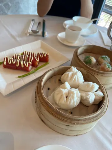 今日难得中午有机会嚟到饮茶,还有对着海景座位,可以慢慢品尝美味点心。虾红米肠粉啲虾非常爽口,鲜甜香脆。樱花虾蒸粉果水晶粉皮,晶凝通透。香煎萝卜丝饼就有点意外,以为好似萝卜丝酥饼咁样,原来佢系萝卜丝,再加一啲虾胶混合一起煎成,烟烟韧韧别有一番风味。A4和牛葱香炒饭,饭粒分明,味道香浓。