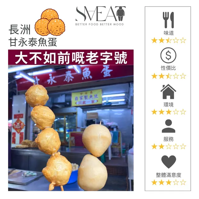 在新聞得悉位於長洲老字號「甘永泰魚蛋」快結業!真的覺得很可惜。它家的魚蛋味較濃、口感又滑。雖然近年的味道每況愈下,但我每次到長洲都必訪的店舖。每次都必點原味魚蛋和魚肉釀豆卜。原味魚蛋,不需要任何醬料,但就能食到獨一無二的「鮮味」。魚蛋味很濃,而且很彈牙。魚肉釀豆卜,這款小吃是我個人最愛,但是不是每一日都可以提供,有時機器壞了就不能提供。魚肉釀豆卜是即叫即炸的,所以炸出來是特別香脆的,而且中間的魚肉醃得很入味,口感有層次。小店很細心,炸完會用紙巾包住食物給客人,這個做法很好,因為可以用紙巾吸收返多餘油脂,就不會很有油膩感!希望小店可以有重開的一日。…查看更多