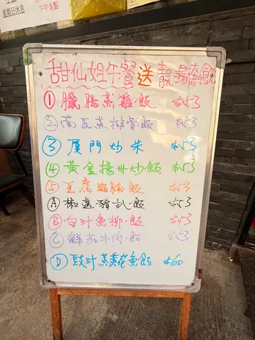 👉田湾小店《甜仙姐》,位处香港仔田湾街口。。。👆午餐每日均有多款选择,$53(蒸鱼$60)包例汤、热饮☕️ (冻饮🥤+$2)👇午餐份量超级劲大份,白饭🍚用汤面碗盛载,为普通饭碗2碗份量,成为附近一众工友的饭堂。。。正常饭量的人记得叫少饭以免浪费‼️📌椒盐猪扒饭 $53 ~ 猪扒切成条状方便食用,肉质腍滑。最爱大量蒜蓉增香,咸香冶味,瞬间清盘‼️📌豆腐班腩饭 $53 ~ 班腩、豆腐均大大件,份量适中,汁酱下饭一流。。呢啲无骨𩠌,真系老少咸宜。☺️📌豉汁蒸黄花鱼饭 $60 ~ 新鲜黄花鱼,肉质嫩滑,简单用豆豉蒸,健康又好味。。😋~~例汤好够味,又足料,绝不是例水😆😍人情味小店,连杯茶都做得香浓细致,好味又抵食,下次会再嚟🥳🏬 甜仙姐 (香港仔)🚦 香港仔田湾石排湾道88A号地舖…查看更多