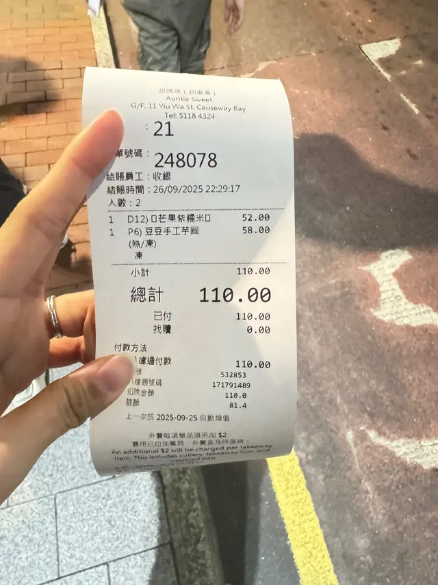 甜姨姨,位于香港铜锣湾耀华街11号地舖,系一间以甜品为主嘅餐厅。今次我哋试咗佢哋嘅豆豆手工芋圆同埋芒果紫米。首先,豆豆手工芋圆嘅味道非常独特,芋圆嘅Q弹口感同豆豆嘅香甜完美结合,再加上啲糖水嘅滋润,整体感觉好满足。其次,芒果紫米嘅味道清新,芒果嘅鲜甜同紫米嘅香糯相得益彰,再加上啲椰奶嘅浓郁,每一口都令人回味无穷。再者,甜姨姨嘅环境有少许逼迫,但服务态度好。虽然要排队,但系等待嘅时间并唔算太长,而且食物嘅质量同味道都值得等待。最后,甜姨姨嘅价钱合理,两个人食咗$110,性价比高,系一间值得推介嘅甜品店。记得吾收现金:) 总括嚟讲,甜姨姨嘅食物质量高,味道好,环境舒适,服务态度好,价钱合理,系一间值得推介嘅甜品店。…查看更多