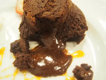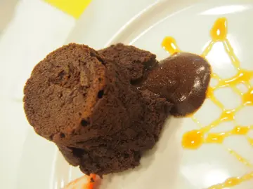 流沙包在下曾经吃过,但是朱古力心太软的流心在下却还未试过,这只是在下一宜暂不想试。然而今天来到甜品店,不妨一试吧。之前三月尾在下曾经造访过甜屋,店舖环境不用再介绍了。当在下进入时女店员显然认得在下,在下也认得女店员呢!并向她落单。比利时朱古力心太软伴雪糕。朱古力旁有一朱古力酱,相信是点缀而言,当在下把羹舀时,内里的朱古力酱顿时立即流出。吃一口朱古力,味道浓郁,也如上次吃过的黑松露朱古力饼的浓度一度,也是用上了七十五度朱古力制作,而且热烘烘的。旁边的云呢嗱雪糕,也充满了云呢嗱味,而且是也很滑溜。据店员说,原来在下去过的甜品庄,是同属姊妹店和同一老板呢!