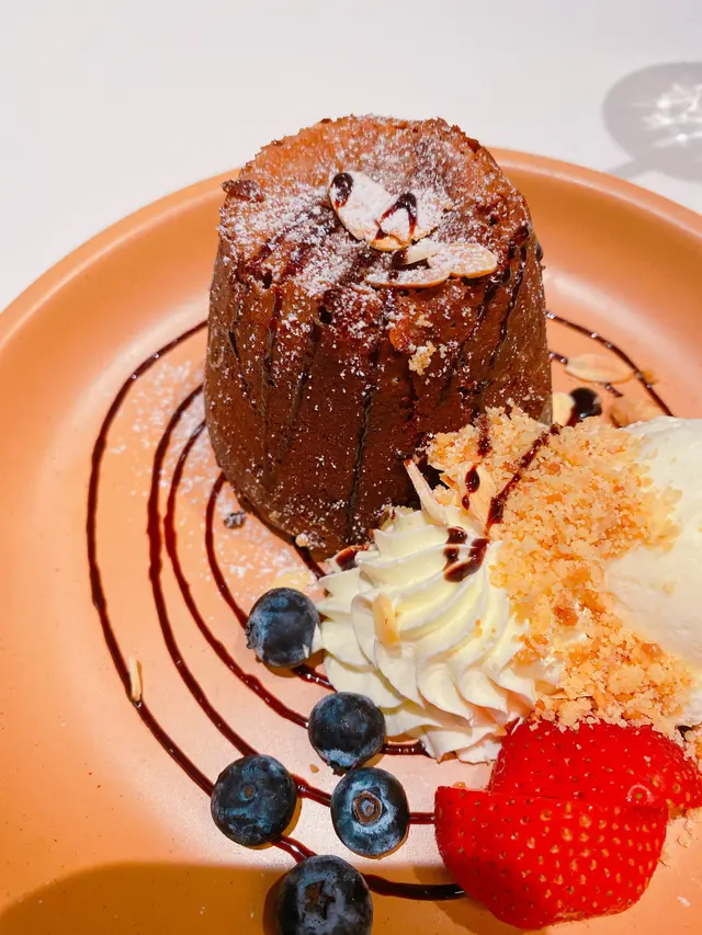 酥皮面铺满苹果蓉,吉士酱汁,新鲜士多啤梨同蓝莓,酥皮松化。 还配上两球自选味道的雪糕,相当满足