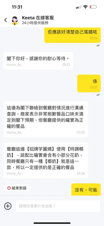 完全没有椰奶嘅味道我系觉得上次好食,今日先嗌如果我要花奶嘅话,我就唔会嗌呢个商家表示非常抱歉餐品口味未满足到阁下预期,但餐厅提供的确实为正确的餐品餐厅这边【招牌芋圆烧】使用【特调椰奶】,该配比确实会含有小部分花奶,同时餐厅只有一种【椰奶】就是这一款,所以一定提供的是正确的餐品