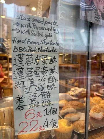$20 5件叉烧酥:好食!!!(热食应该更加好食🤩)叉烧馅调味好有层次,应该有另外加蚝油?同埋唔会好稀👍皮唔会太厚但有啲痴牙豆沙酥:一样皮唔会太厚但有啲痴牙莲蓉棋子饼:其实同迷你版嘅莲蓉月饼无乜分别🤣(佢地而家都有卖月饼~$30一个)但带少少咸味唔会死甜👍莲蓉蛋黄酥:系无咁甜嘅酥皮月饼🤣$10 2件核桃酥:劲大件(大过手掌)仲有半粒核桃,但偏干唔系特别好食,同埋中间最厚𠮶部分有臭粉味😕老婆饼:又系咁大件🤩第一次要用到软糯呢个形容词🤩甜度唔就食到好似有椰丝💯💯记得以前试过新鲜出炉蛋挞都好食!🤩🤩卖得好平好扺食…查看更多