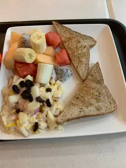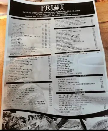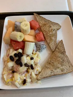 炎热天气,午餐食乜嘢好呀!确实不想吃饭,不如就公司附近嘅生果报社 Fruit Magazine环境ok 好,坐得舒服,点餐 付款后,稍后 店员奉上食物, 好呀睇睇 lunch menu : 有沙律,焗薯、三文治 、 意粉、配餐汤或冷 热饮品(同价)或另加$6 转果汁点了 😊粟米🌽沙律拼鲜什果配蜜糖十二榖多士 $46,健康有益 12谷 多士,甜甜蜜蜜 🍯😋甜甜粒粒粟米,爽脆苹果、提子干、滋味沙律酱新鲜什果🤗 火龙果、消息西瓜、密瓜、香蕉🍌冻柠檬🍋水,少甜少小冰,爽呀!食饱啦!返工 😀,下次再嚟 👌