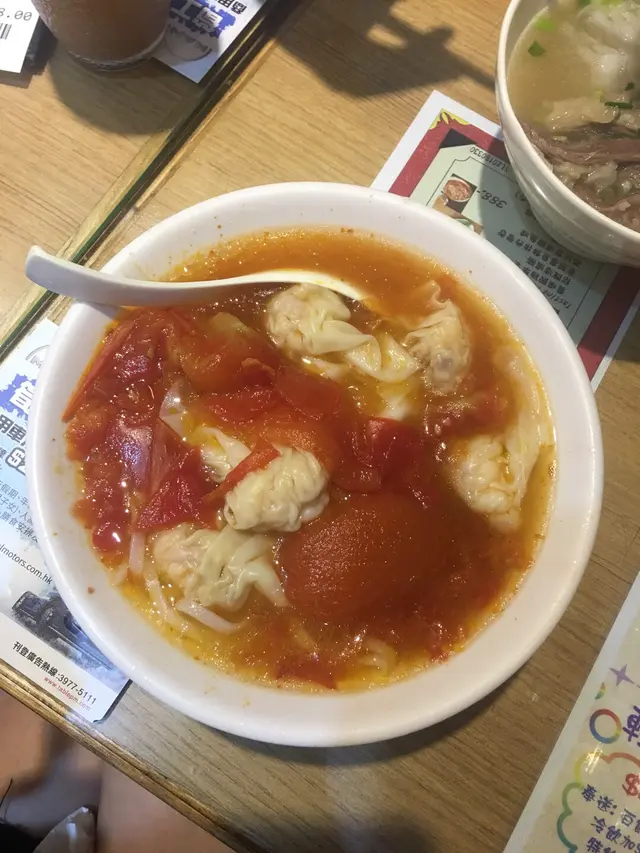 🐹跟鼠友來個快食,所以入了這家清湯腩。鼠友叫了清湯腩河,而🐹見菜單上寫著番茄湯底是用上百棵原粒番茄原汁原味煮出來,很吸引的樣子,於是叫了個番茄雲吞河。平時很少在街坊店試跟風出來的新款,一試就是中伏的開端。鼠友的清湯腩河正正常常,一般水準。等了很久,番茄雲吞河終於上枱,馬上嘗嘗湯底。甜到,這個甜不是番茄的甜,是糖的甜。
