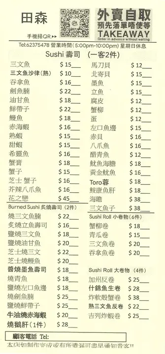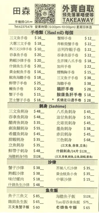 三人行又嚟咗田森,舖位细细祗有4个位,主力做外卖🥡,老板负责料理,老板娘就落单收钱楼面一脚踢,由于是即叫即做,故需要耐心等候🥰,但见到食物嘅新鲜度就觉值得🍣🍣🍣每次必食炸软壳蟹手卷22元一件
