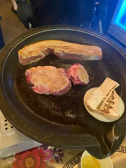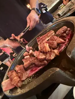 Set A 是牛肉愛好者不可錯過的一餐,絕對能滿足對牛肉的所有期待!這套餐點的重頭戲是那根超大份量的牛排骨,光是視覺效果就已經令人食指大動。牛排骨的肉質非常嫩,尤其是靠近排骨的筋膜部分,咬下去的爽口和嚼勁十足,既不過於硬韌,也不會太油膩,每一口都能感受到肉汁在口中迸發的滿足感。除了牛排骨,套餐中的蒸蛋也是一大亮點。這道蒸蛋不僅口感滑嫩,而且帶有一種獨特的風味,似乎加入了店家特製的調味,讓人忍不住想多挖幾口品嚐。整體的搭配讓人感覺非常用心,每一道配菜都在提升主菜的層次感。更值得一提的是,店內提供的服務非常貼心。烤肉由專業的店員代為服務,火候掌握得恰到好處,客人完全不需要親自動手,省去許多麻煩,輕輕鬆鬆就能享受一頓美味的牛肉大餐。這樣的貼心服務,加上絕佳的食材品質,讓整個用餐過程更加愉悅。對於牛肉迷來說,Set A 絕對是一次令人難忘的美食體驗!查看更多