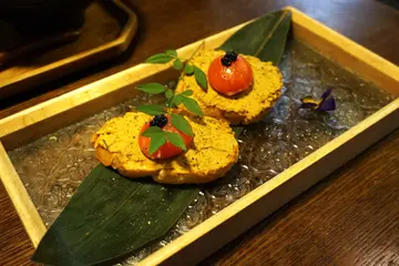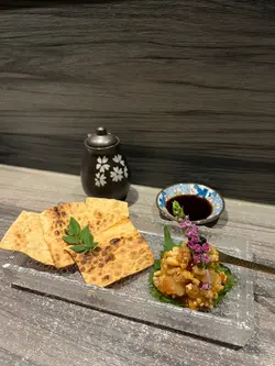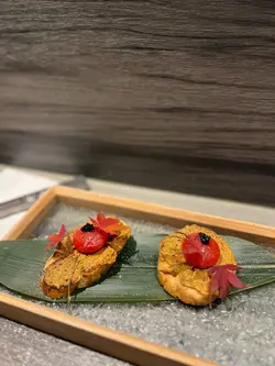 先试试一道前菜类,加咗啲黑鱼籽同花串,卖相非常精致。将牡丹虾刴成细碎,但又未至于成蓉,保留番牡丹虾嘅黏糯口感,而且,非常鲜甜,加埋混入蟹籽同松子仁,再配埋脆到好似薯片咁嘅鳕鱼片,味道与口感嘅层次都十分丰富,好有惊喜。
