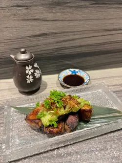 我同老友向来都钟意食牛脷,所以,见到呢道牛舌芯,当然要会一会佢。啲牛舌芯好够厚身,烧得恰到好处,外层微焦香口,咬落软软又有份柔韧弹牙感,味道带有牛舌独特嘅香膻味。因为本身洒咗盐嚟烧,所以,再沾岩盐或柚子胡椒就有啲偏咸,个人觉得洒啲柠汁,再黐啲葱花食就最正。