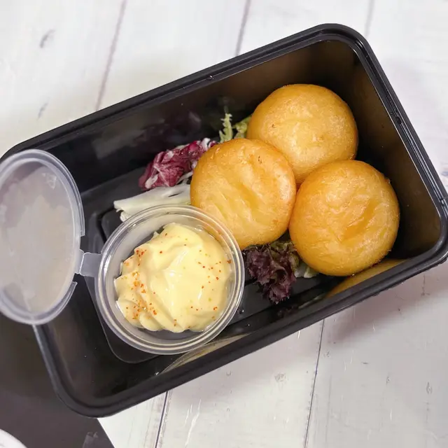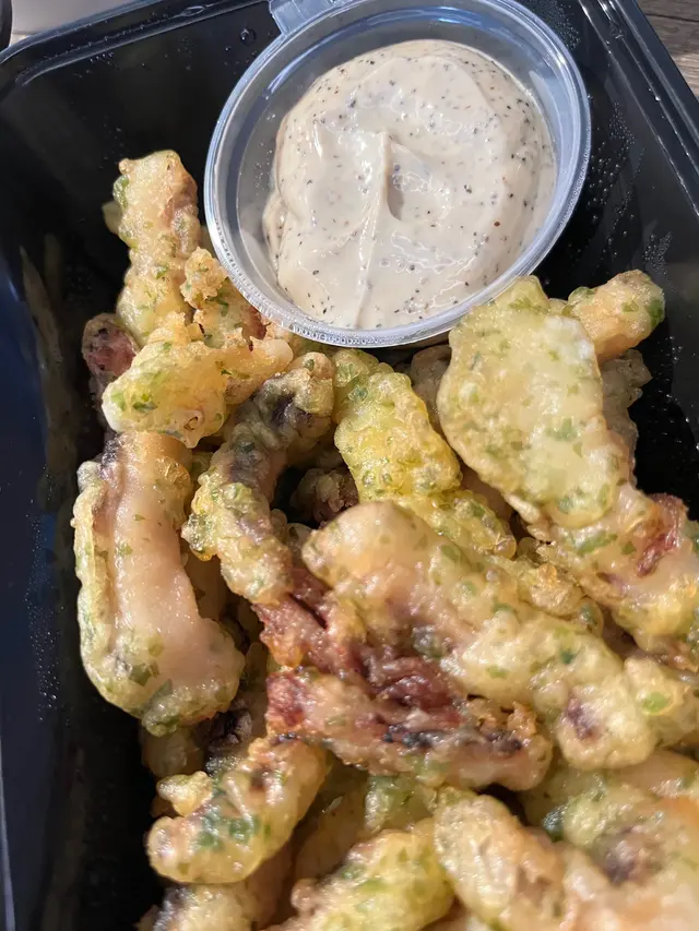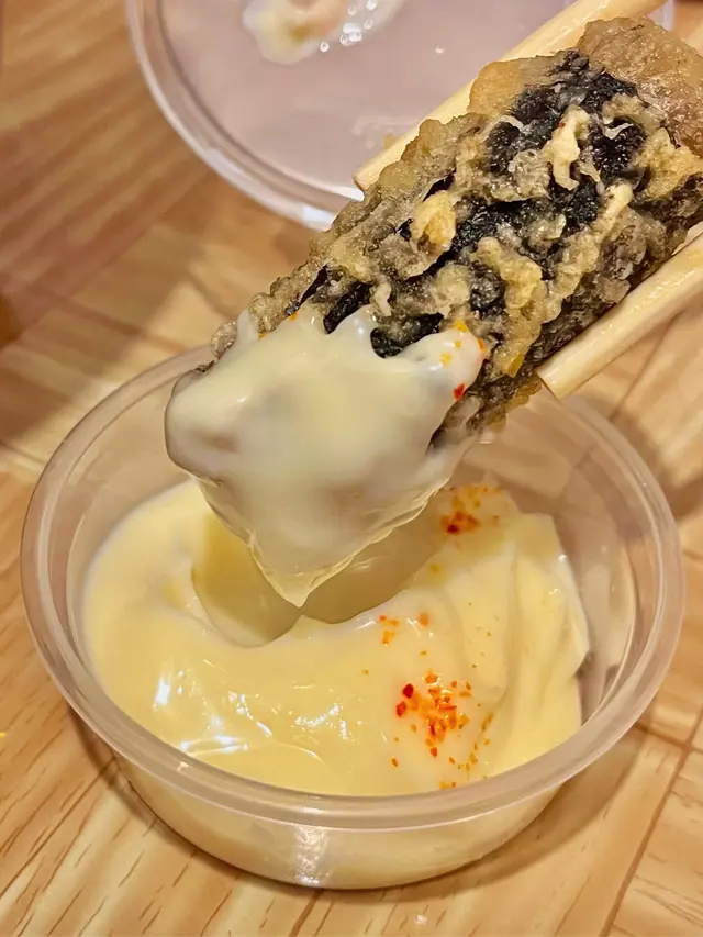 磯燒魷魚天婦羅配黑椒蛋黃醬